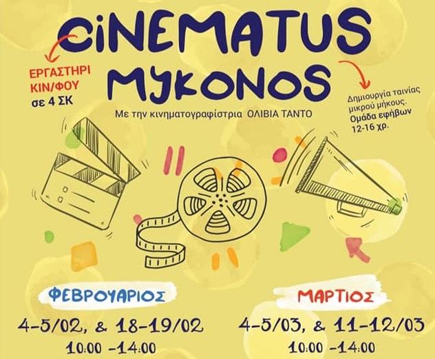Τον Φεβρουάριο ξεκινάει επίσης τις δράσεις της η κινηματογραφική εφηβική ομάδα του νησιού που θα δημιουργήσει - μαζί με την κινηματογραφίστρια Ολίβια Τάντο- τη δική της ταινία μικρού μήκους, στο εργαστήρι Cinematus Mykonos, το οποίο θα ολοκληρωθεί σε τέσσερα Σαββατοκύριακα.