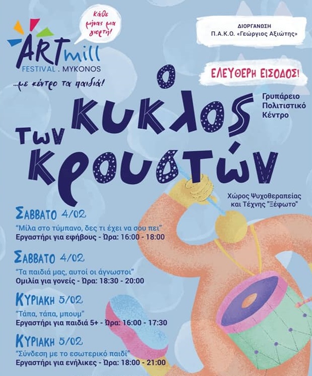 Το Art mill Festival είναι μια διοργάνωση του Π.Α.Κ.Ο."Γ.ΑΞΙΩΤΗΣ " για παιδιά και έφηβους που πρωτοεμφανίστηκε τον Μάιο του 2022, μετά από πρωτοβουλία της καλλιτεχνικής του διευθύντριας Μυρτώς Μολανδώνη, εισπράττοντας τη μεγάλη αποδοχή του κοινού και της τοπικής κοινότητας. Αυτήν την περίοδο, τo ξεχωριστό φεστιβάλ της Μυκόνου, βρίσκεται στην τελική ευθεία των πολιτιστικών του δράσεων, ολοκληρώνοντας μία ιδιαίτερα πετυχημένη χρονιά.