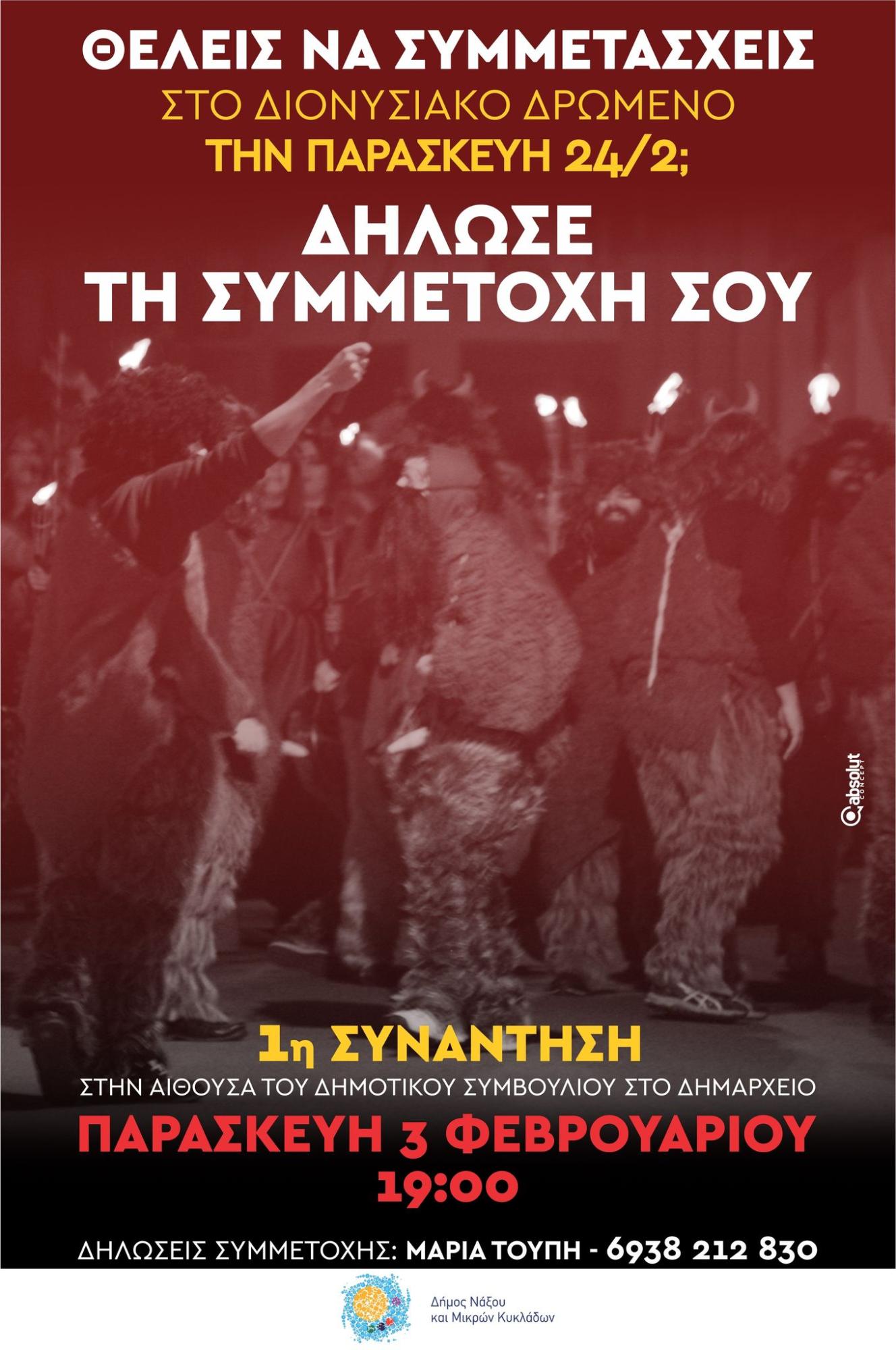 Η προετοιμασία για το Διονυσιακό Δρώμενο της τελευταίας Παρασκευής της Αποκριάς ξεκίνησε στη Νάξο. Καλούνται όσοι επιθυμούν να λάβουν μέρος στο δρώμενο, να δηλώσουν συμμετοχή στο τηλέφωνο 6938212830.