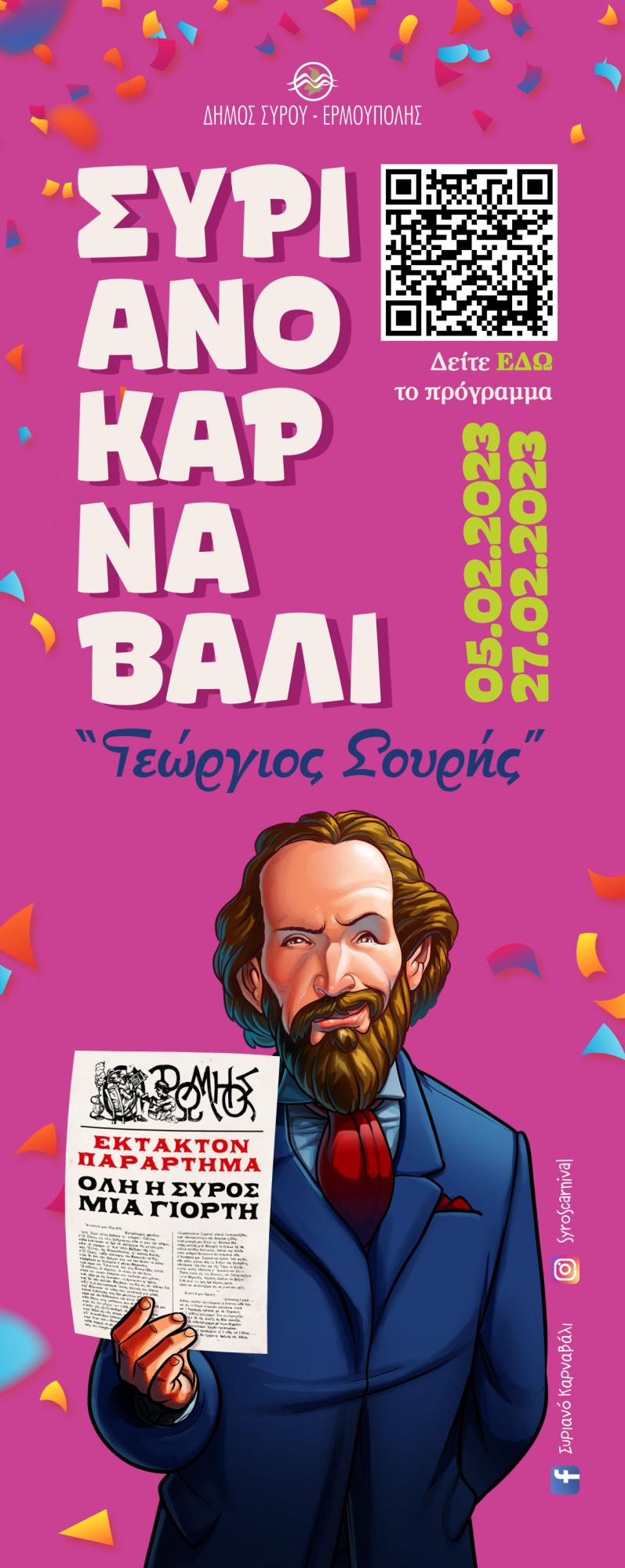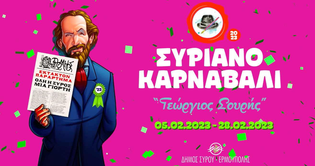 Κυκλοφόρησε το επίσημο πρόγραμμα για το Συριανό Καρναβάλι "Γεώργιος Σουρής" 2023 από το Τμήμα Πολιτισμού του Δήμου Σύρου-Ερμούπολης.