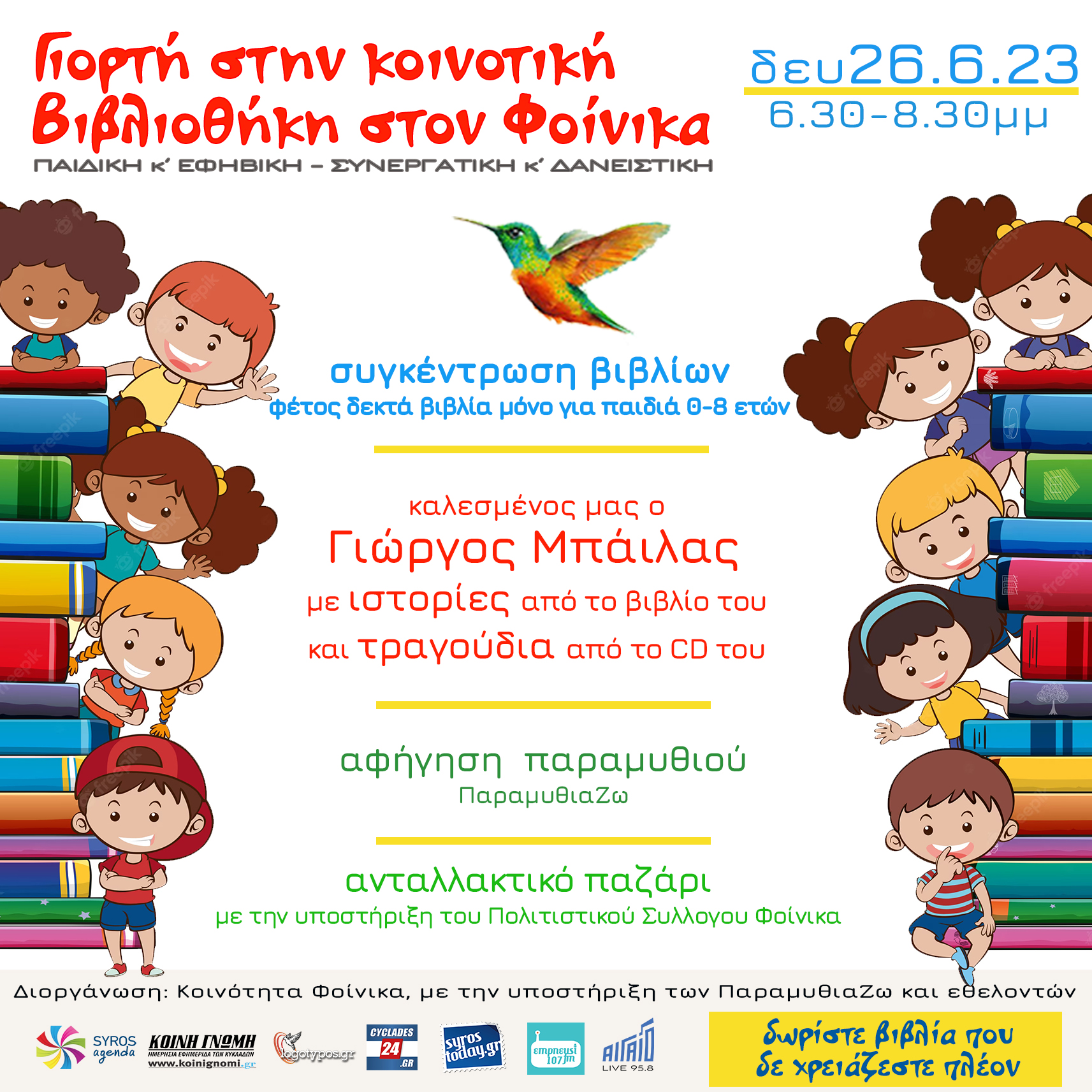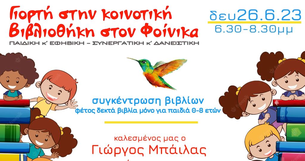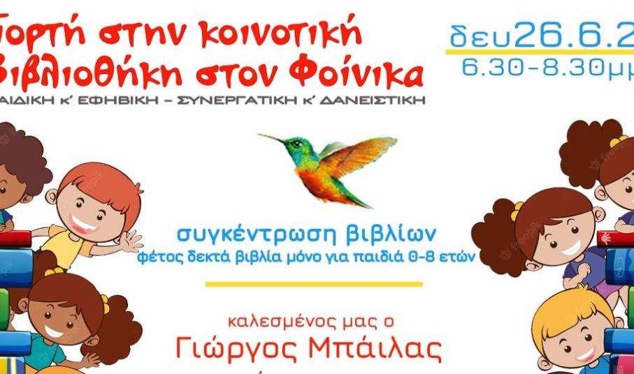 Η Κοινότητα Φοίνικα, με την υποστήριξη της ομάδας αφήγησης ΠαραμυθιαΖω και ομάδα εθελοντών, διοργανώνουν εκδήλωση για να γιορτάσουν τον τρίτο χρόνο λειτουργίας της Βιβλιοθήκης, την Δευτέρα 26 Ιουνίου 2023, 6.30‑8.30 μμ, στον ευρύτερο χώρο της Βιβλιοθήκης, που βρίσκεται πάνω από το ΚΑΠΗ Φοίνικα.
