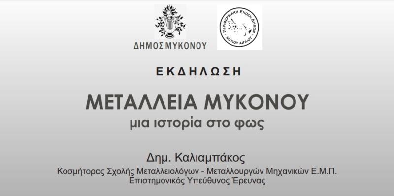 Θα παρουσιαστούν στο κοινό και στην επιστημονική κοινότητα, τα αποτελέσματα του ερευνητικού προγράμματος «Καταγραφή και ανάδειξη της μεταλλευτικής ιστορίας της Μυκόνου» του Εθνικού Μετσόβιου Πολυτεχνείου από τον Επιστημονικό Υπεύθυνο του Προγράμματος Καθ. Δημήτρη Καλιαμπάκο, Κοσμήτορα της Σχολής Μεταλλειολόγων Μεταλλουργών Μηχανικών του E.M.Π. Παρούσα και ομιλήτρια και η Δ. Λοΐζου-Βουλγαράκη, Ερευνήτρια της τοπικής μεταλλευτικής ιστορίας. Μια σημαντική στιγμή για την ιστορία της Μυκόνου.