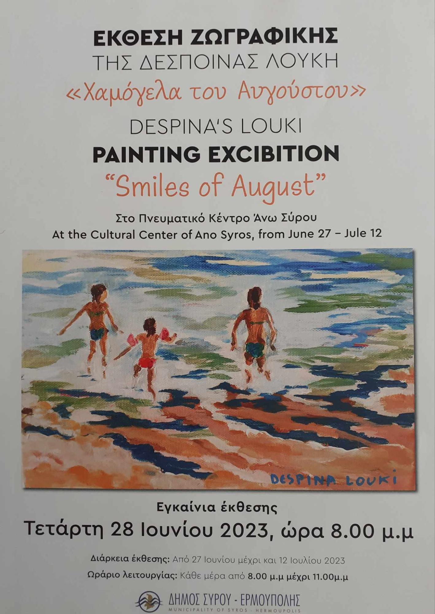 Στην έκθεση “Χαμόγελα τ’ Αυγούστου”, τα εγκαίνια της οποίας θα πραγματοποιηθούν στις 8 το απόγευμα της Τετάρτης στην αίθουσα του Πνευματικού Κέντρου της Άνω Σύρου, η κα. Λουκή παρουσιάζει ένα νέο σώμα δουλειάς των τελευταίων δύο ετών, που αποτελείται από ζωγραφικά έργα (ακρυλικό σε καμβά) εμπνευσμένα από το έντονο φως των Κυκλάδων, το καλοκαίρι, τον ήλιο, το γαλάζιο της θάλασσας, τις αναμνήσεις του καλοκαιριού, την ξεγνοιασιά των διακοπών, τα παιχνίδια στην αμμουδιά…