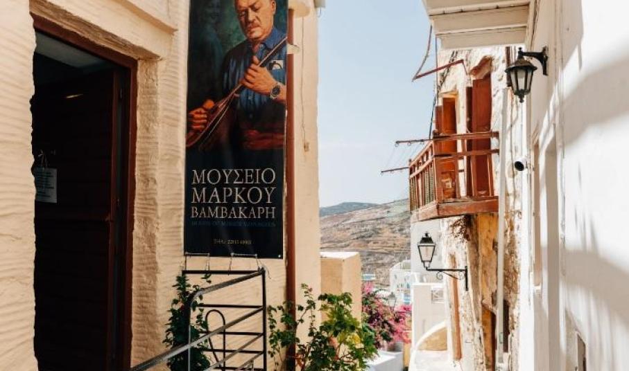Η φωνή του Μάρκου Βαμβακάρη, απόλυτα ταυτισμένη με τα ρεμπέτικα τραγούδια, έκανε γνωστή τη Σύρο και τις ομορφιές της με την αγαπημένη σε όλους «Φραγκοσυριανή», εκφράζοντας την αγάπη του συνθέτη για τον τόπο του. Ανταποδίδοντας αυτή την αγάπη, οι Συριανοί δημιούργησαν μια μόνιμη θεματική έκθεση προς τιμήν του, η οποία αποτελείται από δύο ενότητες και αναπτύσσεται σε δύο χώρους στην Πιάτσα της Άνω Σύρου.