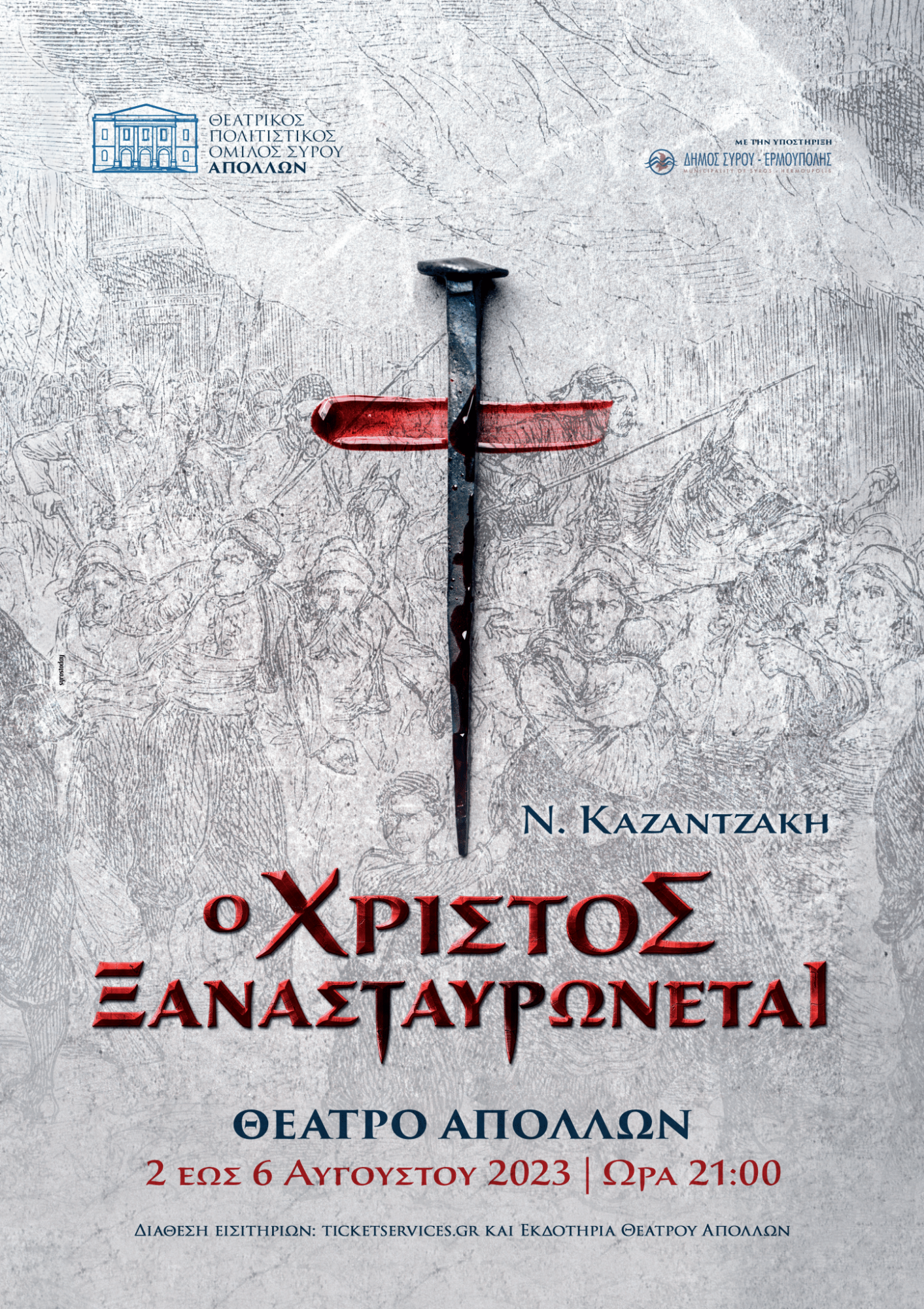 Μετά τις άκρως επιτυχημένες παραστάσεις του περασμένου Απριλίου, ο Θεατρικός Πολιτιστικός Όμιλος Σύρου “ΑΠΟΛΛΩΝ”, τιμώντας τα 140 χρόνια από τη γέννηση του σπουδαίου συγγραφέα, ποιητή και δραματουργού Νίκου Καζαντζάκη παρουσιάζει από την Τετάρτη 2 Αυγούστου έως και την Κυριακή 6 Αυγούστου 2023 τη θεατρική διασκευή του έργου του “Ο Χριστός Ξανασταυρώνεται”, στο θέατρο ΑΠΟΛΛΩΝ, ώρα 21:00.