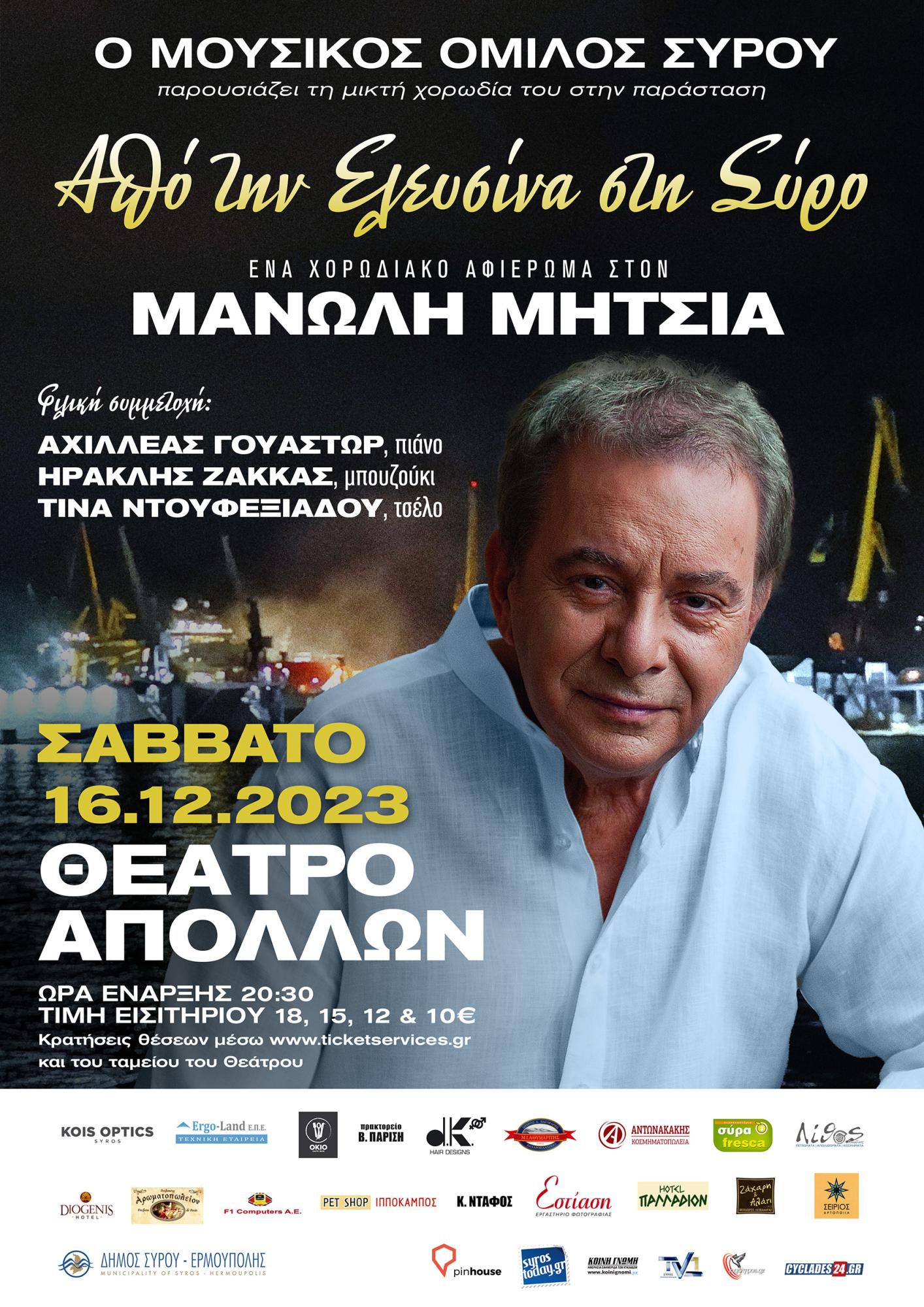 Τα 55 χρόνια συνεχούς παρουσίας και προσφοράς του Μανώλη Μητσιά στο ελληνικό μουσικό στερέωμα, θέλει να τιμήσει ο Μουσικός Όμιλος Σύρου, που διοργανώνει ένα μουσικό χορωδιακό αφιέρωμα στον καταξιωμένο ερμηνευτή, το Σάββατο 16 Δεκεμβρίου στις 20:30, στο θέατρο Απόλλων.