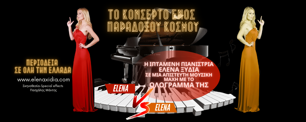 Μια εξαιρετική θεατρική παράσταση και ταυτόχρονα μια παγκόσμια καινοτομία θα παρουσιάσει το Σάββατο 30 Δεκεμβρίου στις 20:00 στο θέατρο Απόλλων της Ερμούπολης, η ταλαντούχα Ελληνίδα πιανίστρια, Έλενα Ξυδιά! Σε ένα μαγικό μουσικό show θα εμφανιστεί στη σκηνή με τον ίδιο της τον εαυτό και θα δώσει μια υπέροχη μουσική μάχη με το ολόγραμμά της!