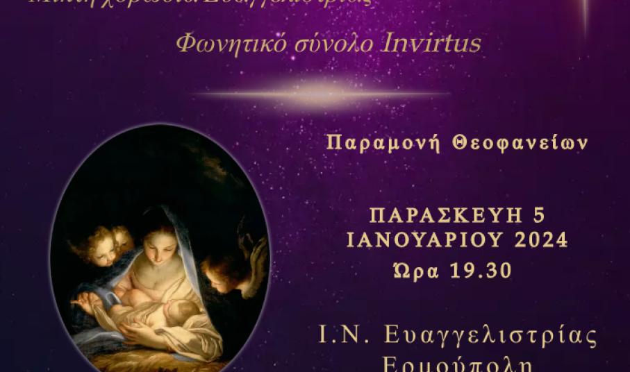 Με ανακοίνωσή της, η Καθολική Επισκοπή Σύρου προσκαλεί το κοινό να παρακολουθήσει τη συναυλία της μικτής χορωδίας Ευαγγελίστριας και του φωνητικού συνόλου "Invirtus" την Παρασκευή 5 Ιανουαρίου (Παραμονή Θεοφανείων) και ώρα 19.30 μ.μ. στον ενοριακό Ναό Ευαγγελιστρίας Ερμούπολη.