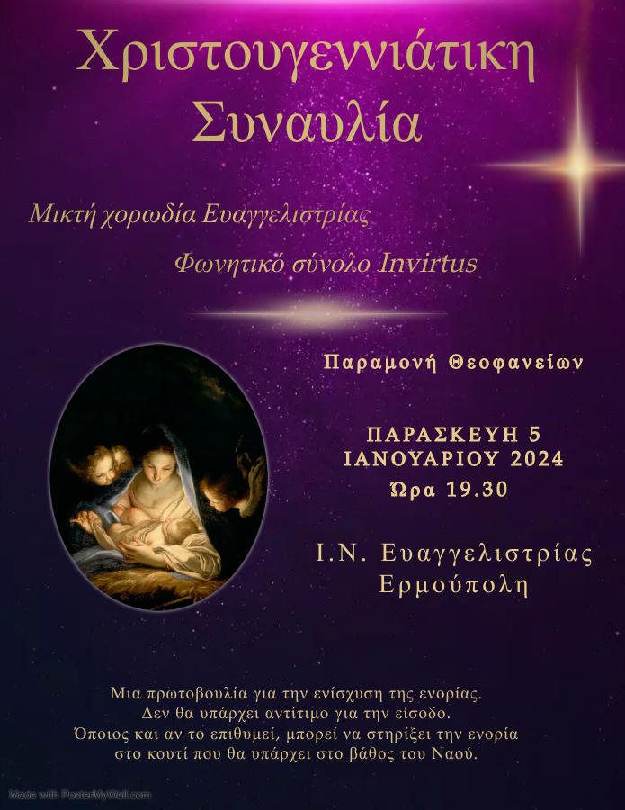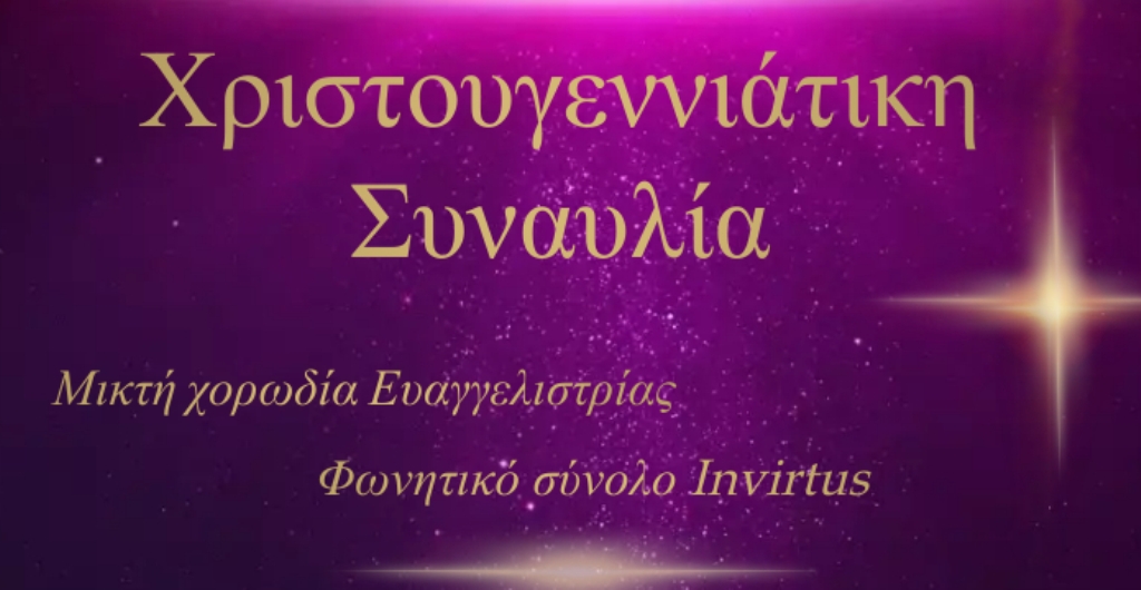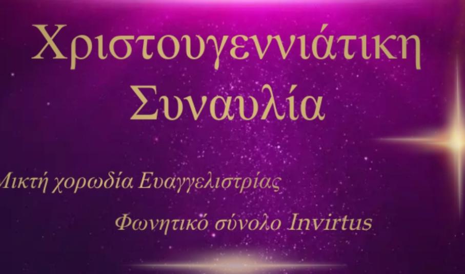 Η συναυλία αυτή είναι μια πρωτοβουλία της χορωδίας Ευαγγελίστριας, του φωνητικού συνόλου Invirtus και του μαέστρου τους Ιωάννη Ρηγούτσου, τους οποίους ευχαριστούμε θερμά, που σκοπό έχει την οικονομική ενίσχυση της ενορίας.