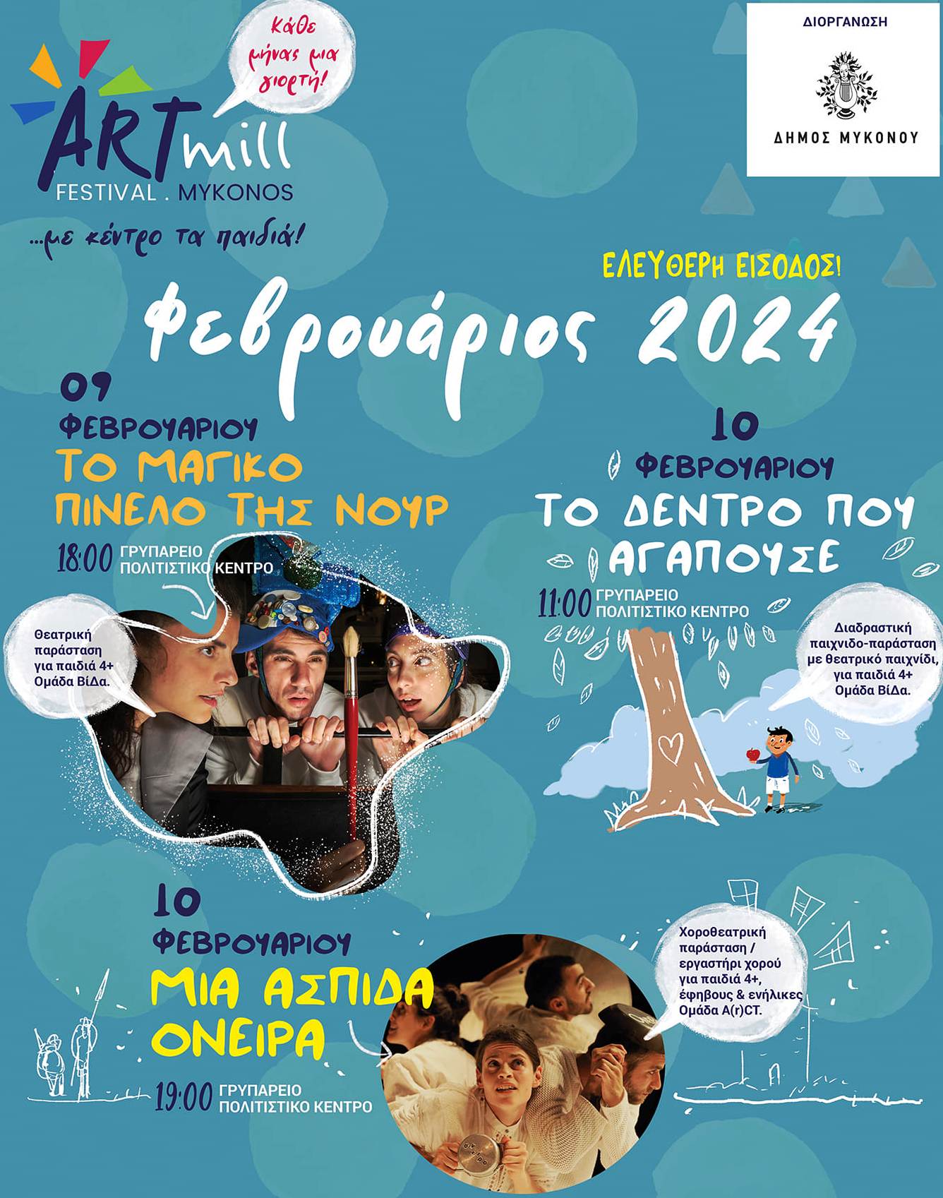 Το Art mill Festival για παιδιά και έφηβους επιστρέφει το 2024 στη Μύκονο με διαδραστικές παραστάσεις που θα πραγματοποιηθούν το μήνα Φεβρουάριο στο Γρυπάρειο πολιτιστικό κέντρο του νησιού.