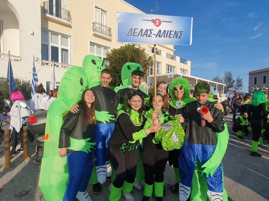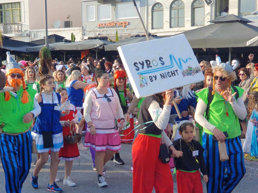 Στη φετινή παρέλαση έλαβαν μέρος σχολικές κοινότητες, Πολιτιστικοί Σύλλογοι, μέλη των ΚΑΠΗ της Σύρου, αλλά και μεμονωμένες παρέες, ενώ τις εντυπώσεις έκλεψε μία πολυμελής ομάδα που έφθασαν στη Σύρο μέσω του γραφείου ταξιδιωτικών εμπειριών Melodrakma Universal. Το “παρόν” έδωσε και μία ομάδα από το Μοσχάτο, που αφού ολοκλήρωσε το κυνήγι του χαμένου θησαυρού στην Αθήνα, συνέχισε τις αποκριάτικες εξορμήσεις της στη Σύρο.