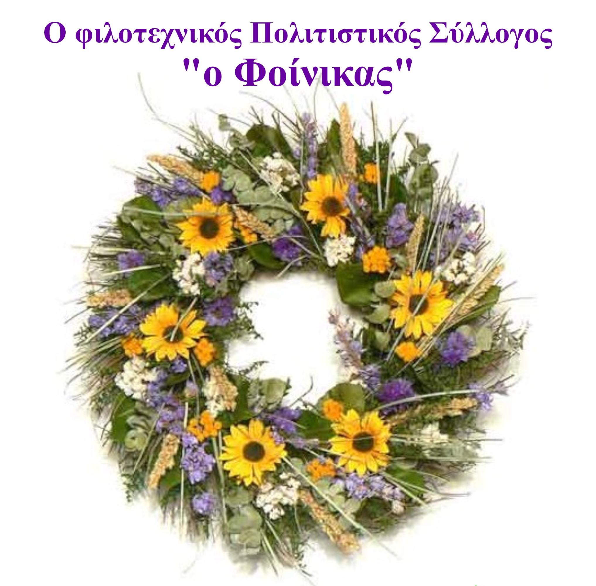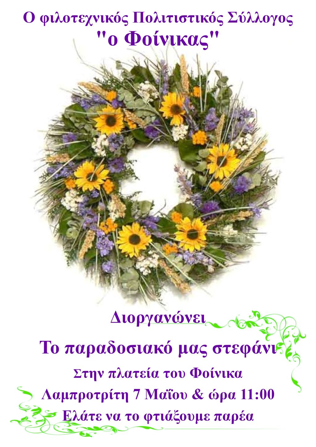 Ο Φιλοτεχνικός Πολιτιστικός Σύλλογος του Φοίνικα διοργανώνει αύριο, Τρίτη 7 Μαΐου, στις 11 το πρωί στην πλατεία της περιοχής, εκδήλωση δημιουργίας του Μαγιάτικου στεφανιού, με θέμα "Το παραδοσιακό στεφάνι".