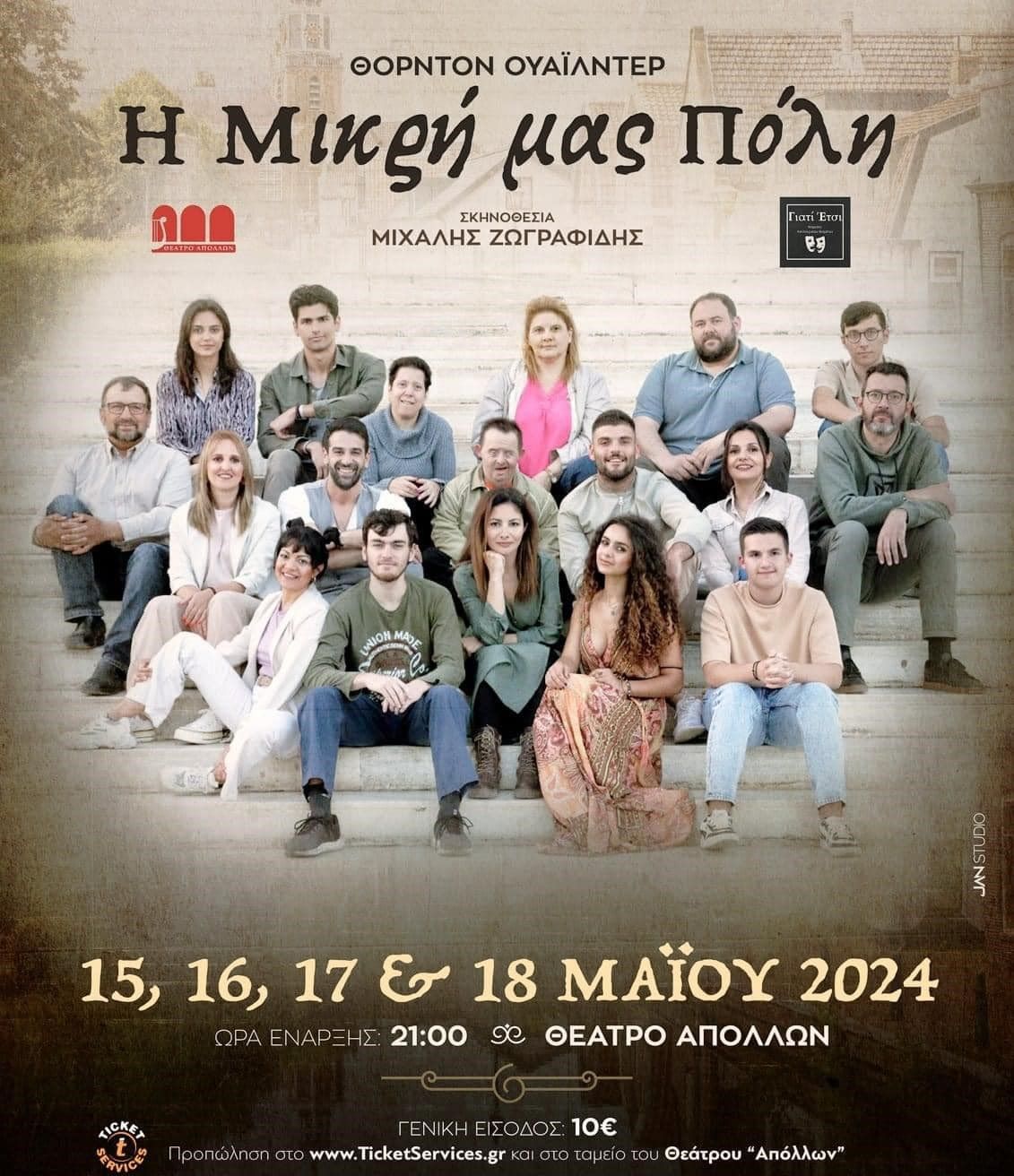 Πρόκειται για το έργο η “Μικρή μας πόλη” που ανεβαίνει από τις 15 Μαίου και για τέσσερις παραστάσεις στο θέατρο Απόλλων.
