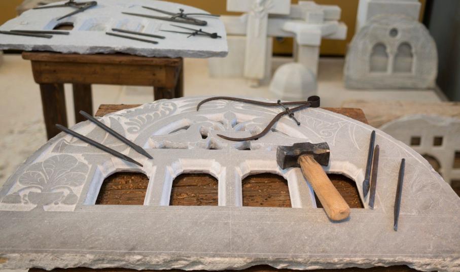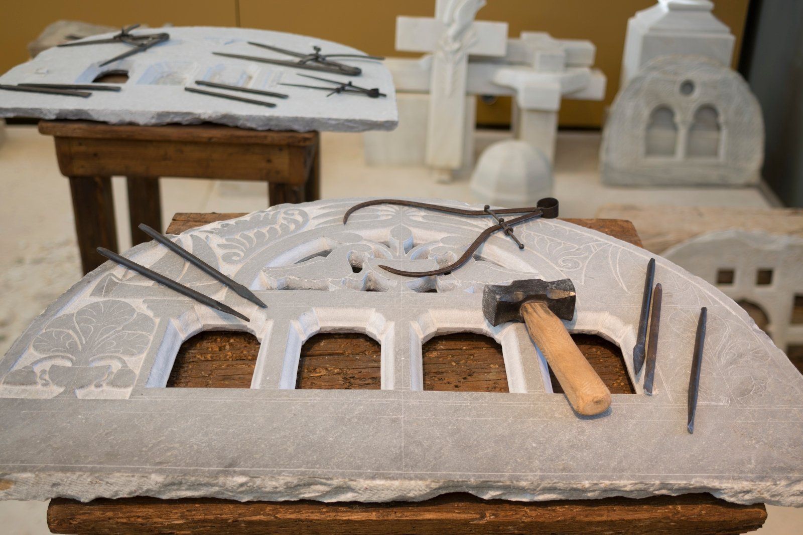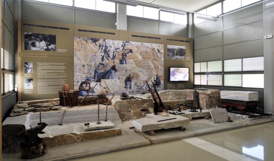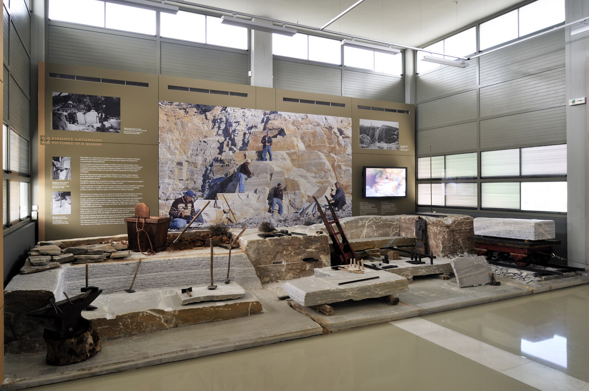 Τα εκθέματα πλαισιώνονται από αλληλένδετες αναπαραστάσεις λατομείου, εργαστηρίου μαρμαροτεχνίας και συναρμογής-τοποθέτησης δεσποτικού θρόνου, ενώ το οπτικοακουστικό υλικό της έκθεσης ζωντανεύει τις παραδοσιακές μεθόδους εργασίας του λατόμου και του μαρμαροτέχνη.