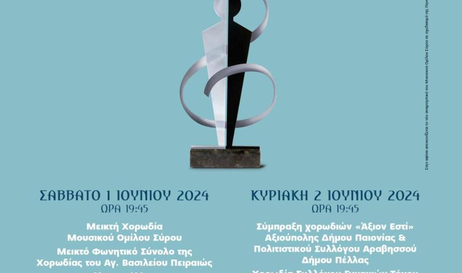 Με τη συμμετοχή της Μικτής Χορωδίας Μουσικού Ομίλου Σύρου, καθώς και διαφόρων χορωδιών από όλη την Ελλάδα, το μουσόφιλο κοινό θα έχει την ευκαιρία το Σάββατο 1 και την Κυριακή 2 Ιουνίου στις 8 παρά τέταρτο το βράδυ στο χώρο το θεάτρου Απόλλων, να απολαύσει τη Μικτή Χορωδία Μουσικού Ομίλου Σύρου, το Μεικτό Φωνητικό Σύνολο της Χορωδίας του Αγ. Βασιλείου Πειραιώς, τη Χορωδία "Απόλλων" του Μουσικού Πολιτιστικού Συλλόγου "Απόλλων" Ν. Ορεστιάδας, τη Χορωδία του Δικηγορικού Συλλόγου Αθηνών, τη Χορωδία "Ηλιόπετρα" του Επιμορφωτικού Συλλόγου Ν. Μάκρης, τη σύμπραξη Χορωδιών "Άξιον Εστί" Αξιούπολης Δήμου Παιονίας και Πολιτιστικού Συλλόγου Αραβησσού Δήμου Πέλλας, τη Χορωδία Συλλόγου Γυναικών Τήνου, τη Μικτή Χορωδία ΚΑΠΗ Κρυονερίου Δήμου Διόνυσου, τη Χορωδία Γονέων και Φίλων Ορχήστρας των Κυκλάδων και τέλος τη Χορωδία του Μορφωτικού Εκπολιτιστικού Συλλόγου Αβέρωφ "ο Θετταλός".