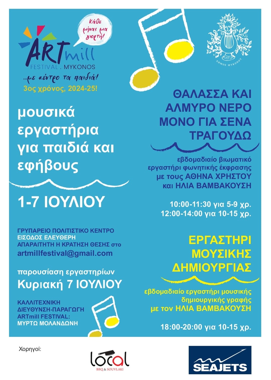 Το πρόγραμμα των εξάμηνων εκδηλώσεων και δράσεων αρχίζει με τα μουσικά εργαστήρια που έχουν προγραμματιστεί για τον μήνα Ιούλιο.