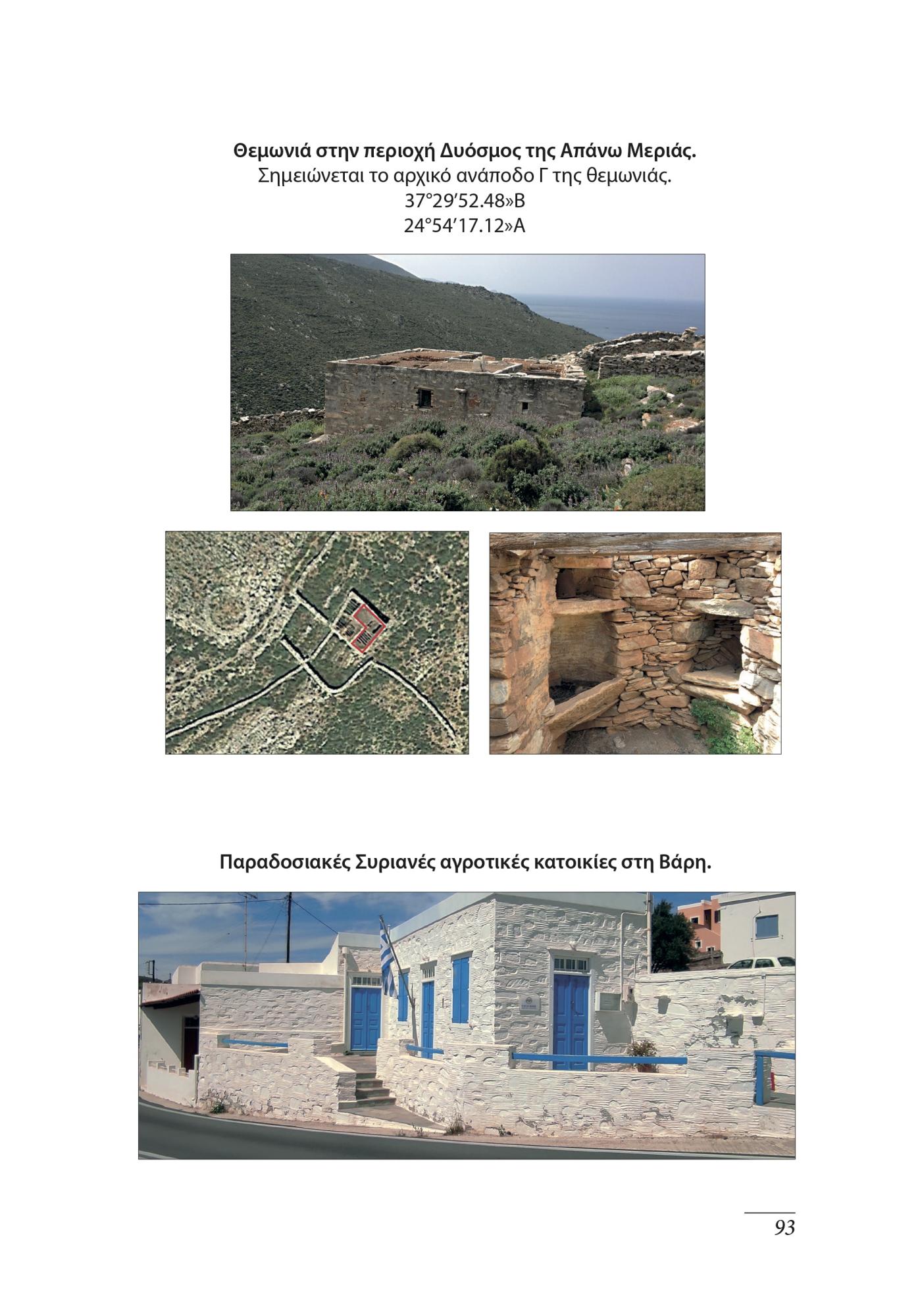 “Από την εποχή της ομηρικής Συρίης με τα πολλά κριθάρια, τα πλούσια βοσκοτόπια, τα δυνατά κρασιά και τα καρπερά δένδρα στις πρόσφατες ημέρες με τα πρώιμα λαχανικά, τα κηπαία, τα κολοκυθάκια, τις μελιτζάνες και τις γαλακτο-τυρομικές συνεταιριστικές εγκαταστάσεις, πίνακες και στατιστικές για τις βροχοπτώσεις, φορολογικοί μηχανισμοί και αγροτική παραγωγή, ανεμόμυλοι, και μυλωνάδες, πρόβατα, κατσίκια και αγελάδες, θεμωνιές, μιτάτα και μαντροκαθίσματα, μελίσσια και μελισσότοποι, ξερολιθιές και πεζούλες, κουζίνα και γραστονομία, αγροτικά ημερολόγια. Ο εποικισμός της Συριανής ενδοχώρας και η δημιουργία των χωριών του νησιού, ο διαρκής αγώνας και η αγωνία για νερό”, περιγράφεται στη σύνοψη του βιβλίου.