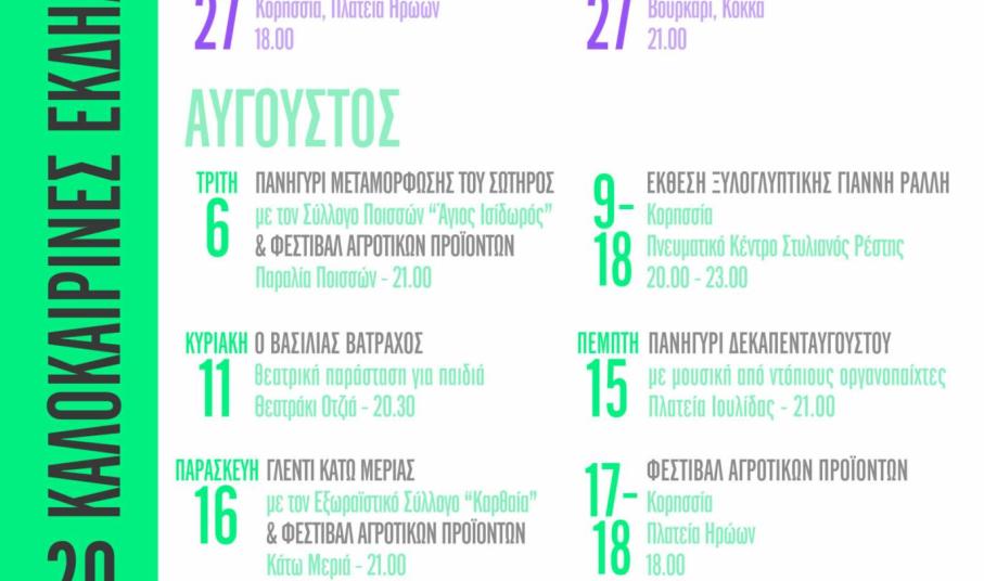 Στο επίκεντρο του καλοκαιρινού προγράμματος βρίσκεται η τέχνη, οι τζιώτικες παραδόσεις, η τοπική γαστρονομία με το Φεστιβάλ Παραδοσιακών Προϊόντων, η μουσική, τα πανηγύρια, αλλά και οι εκδηλώσεις με θεατρικές παραστάσεις για τα παιδιά.