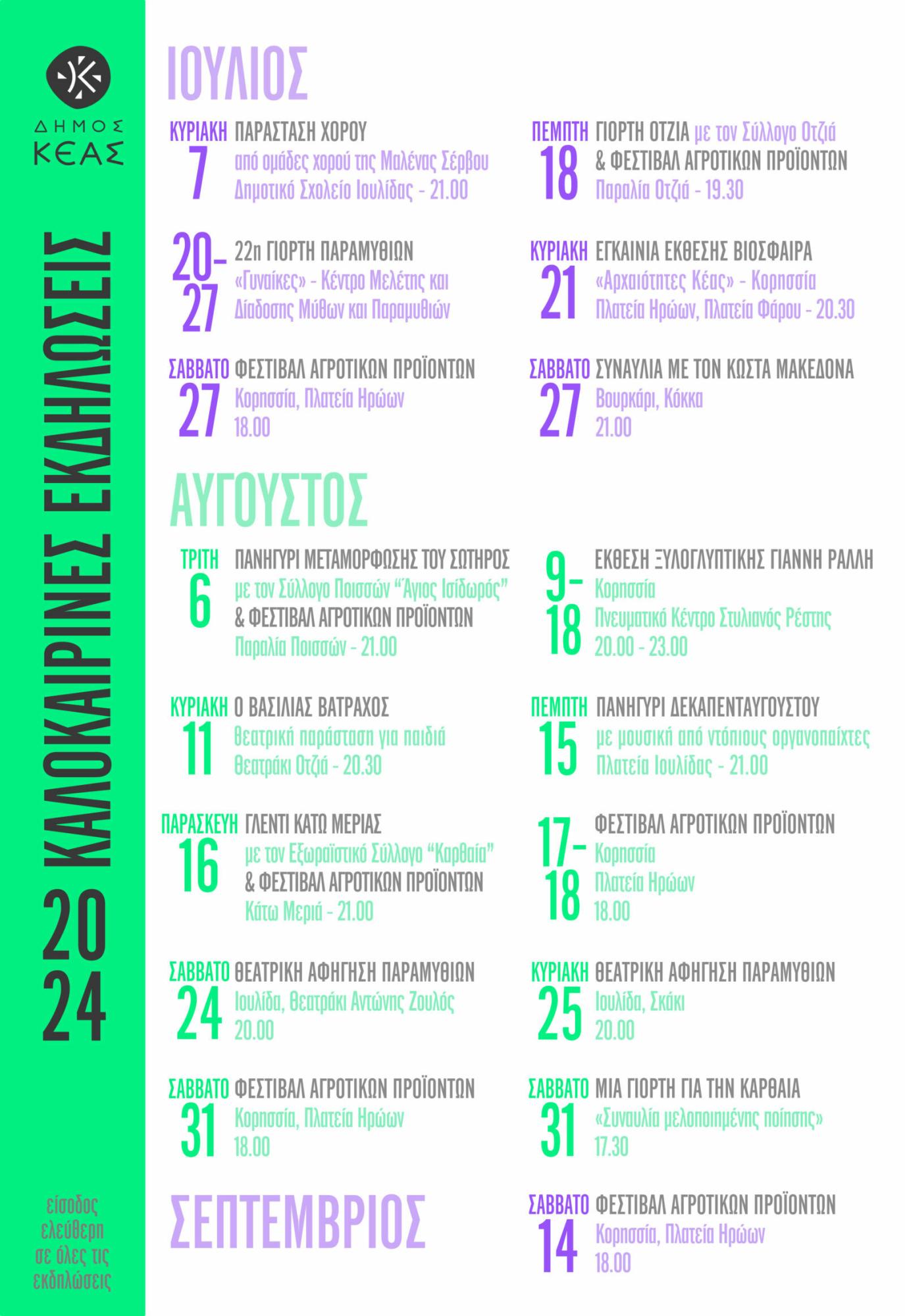 Εκδηλώσεις με έμφαση στον πολιτισμό, αλλά και στην παράδοση, διοργανώνονται τον Ιούλιο και τον Αύγουστο, στο νησί της Κέας.