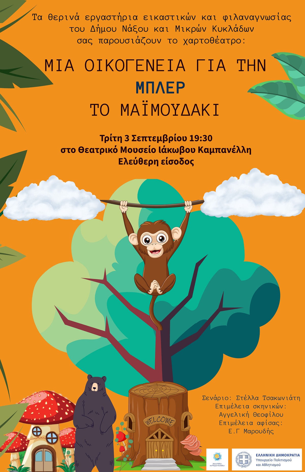Στο πλαίσιο αυτό, τα παιδιά του Εργαστηρίου Φιλαναγνωσίας θα παρουσιάσουν το χαρτοθέατρο «Μια Οικογένεια για την Μπλερ, το Μαϊμουδάκι» της Στέλλας Τσακωνιάτη, την Τρίτη 3 Σεπτεμβρίου 2024 και ώρα 19:30.
