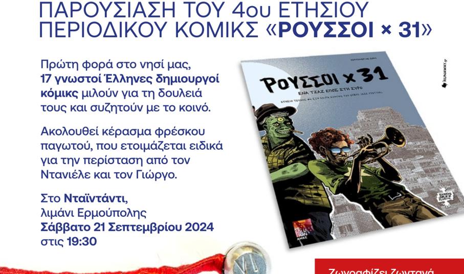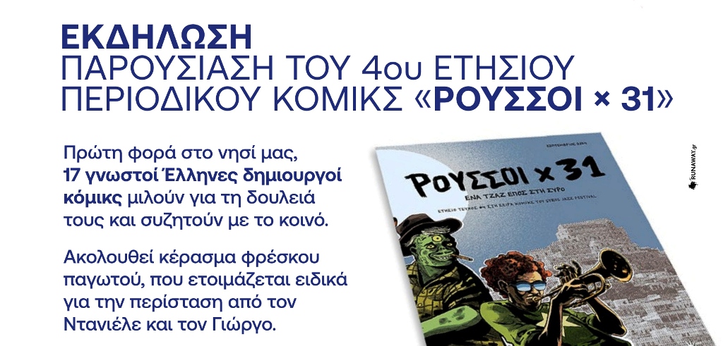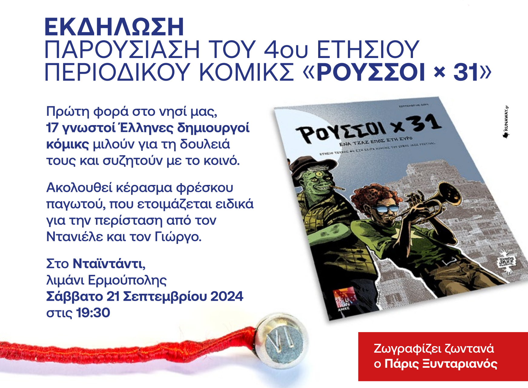 Το βράδυ του Σαββάτου 21 Σεπτεμβρίου 2024, θα παρουσιαστεί το 4ο περιοδικό κόμικς του Syros Jazz Festival, με κεντρικούς ήρωες τους Συριανούς μουσικούς Μαρίνο και Δομένικο Ρούσσο.