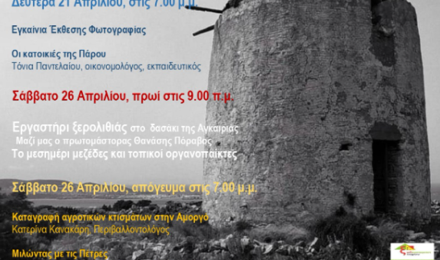 Συγκεκριμένα, στο διάστημα από 21 ως 26 Απριλίου, θα βρίσκεται σε λειτουργία έκθεση με φωτογραφίες από τα αγροτικά κτίσματα που παραμένουν διάσπαρτα στην παριανή εξοχή, ενώ παράλληλα θα πραγματοποιηθούν ομιλίες και παρουσιάσεις σχετικές με το θέμα, όπως επίσης και εργαστήριο ξερολιθιάς.