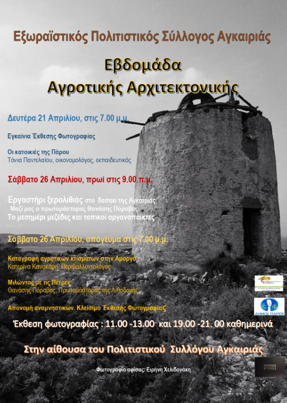 Με στόχο την αναβίωση, αλλά και την αφύπνιση των πολιτών, πάνω στην ομορφιά και τη σοφία που βρίσκεται αποτυπωμένη στα απλά κτίσματα που συνέθεταν το αγροτικό τοπίο της Πάρου, ο Πολιτιστικός Εξωραϊστικός Σύλλογος Αγκαιριάς, διοργανώνει "Εβδομάδα Αγροτικής Αρχιτεκτονικής" που θα περιλαμβάνει έκθεση φωτογραφιών και video από μνημεία της αγροτικής ζωής στην Πάρο, καθώς επίσης και εργαστήρι ξερολιθιάς με τη συμμετοχή του πρωτομάστορα, Θανάση Πόραβου.