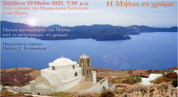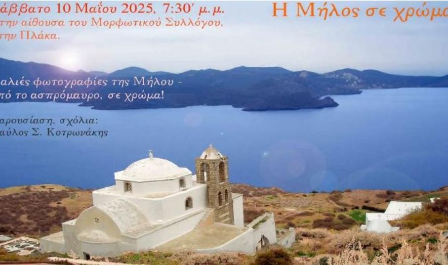 Με την ευκαιρία της συμπλήρωσης 80 χρόνων από την απελευθέρωση της Μήλου από τα γερμανικά στρατεύματα κατοχής, 9 Μαΐου 1945, ο Μορφωτικός και Κοινωνικός Σύλλογος Μήλου διοργανώνει εκδήλωση - παρουσίαση, το Σάββατο 10 Μαΐου, στην αίθουσα του Συλλόγου, στην Πλάκα. Κατά τη διάρκεια της εκδήλωσης με τον τίτλο "Η Μήλος με χρώμα", θα παρουσιαστούν παλιές παλιές φωτογραφίες της Μήλου της εποχής του πολέμου και όχι μόνο, που όμως με τη βοήθεια τεχνητής νοημοσύνης, έχουν μετατραπεί από ασπρόμαυρες σε έγχρωμες. Το παρελθόν της Μήλου, δηλαδή, έρχεται εγγύτερα στο παρόν, με τη βοήθεια της τεχνολογίας.