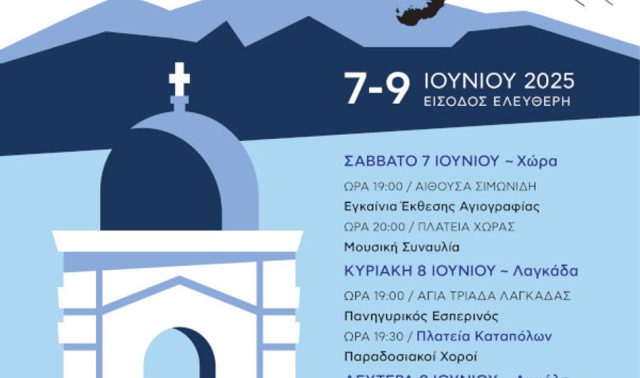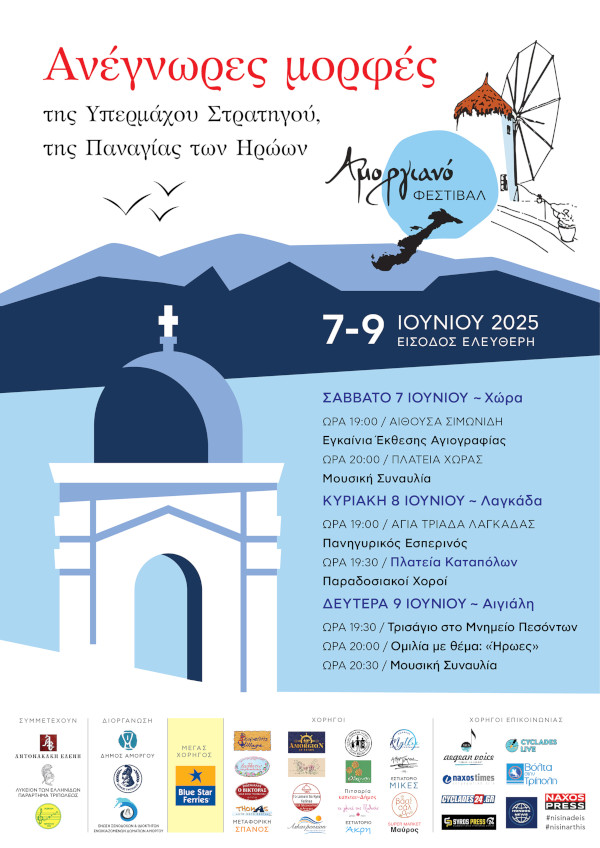 Επιστρέφει στις 7 Ιουνίου, για 2η χρονιά, το Αμοργιανό Φεστιβάλ, το οποίο έχει ως στόχο να αποτελέσει ένα σημείο συνάντησης του πολιτισμού και της παράδοσης. Οι φετινές εκδηλώσεις, οι οποίες διοργανώνονται σε συνεργασία του Δήμου Αμοργού, με την Ένωση Ξενοδόχων και Ιδιοκτητών Ενοικιαζόμενων Δωματίων Αμοργού και τον Δήμο Τρίπολης, έχουν ως θέμα τις "Ανέγνωρες μορφές της Υπερμάχου Στρατηγού, της