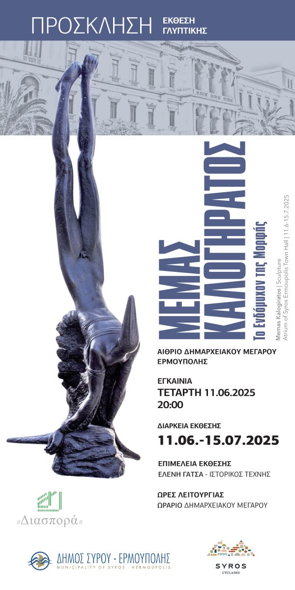 Το Ίδρυμα Ελληνική Διασπορά, σε συνεργασία με τον Δήμο Σύρου - Ερμούπολης και την καλλιτεχνική υποστήριξη της Imagine Visual Arts, παρουσιάζει τη νέα ατομική έκθεση του γλύπτη Μεμά Καλογηράτου, στο εμβληματικό Αίθριο του Δημαρχιακού Μεγάρου Ερμούπολης, από τις 11 Ιουνίου έως τις 15 Ιουλίου 2025.