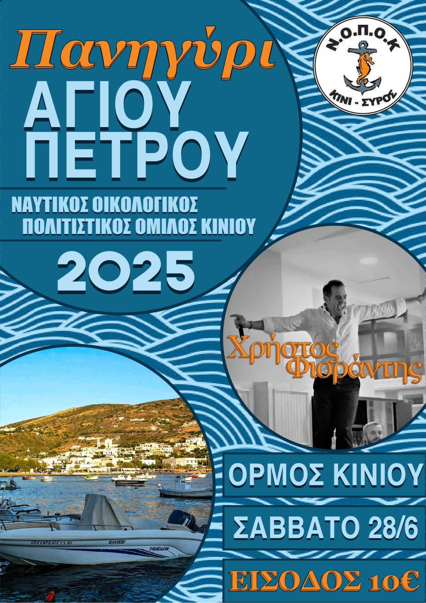 Ο Ναυτικός Οικολογικός Πολιτιστικός Όμιλος Κινίου προσκαλεί κατοίκους και επισκέπτες στο καθιερωμένο Πανηγύρι του Αγίου Πέτρου, προστάτη των ψαράδων,το οποίο θα πραγματοποιηθεί το Σάββατο 28 Ιουνίου 2025, στον μόλο του Κινίου. Η εκδήλωση περιλαμβάνει τόσο θρησκευτική όσο και μουσικοχορευτική διάσταση, τιμώντας την παράδοση και τον πολιτισμό του τόπου.