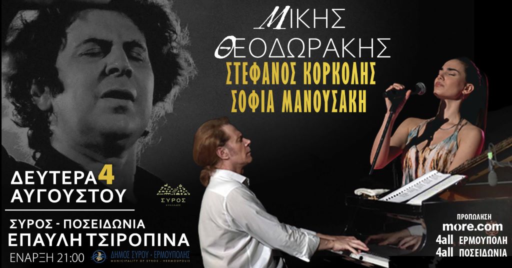 Τέλος, να σημειώσουμε πως η συναυλία θα αρχίσει στις 21:00 και οι τιμές των εισιτηρίων είναι 16 και 18 ευρώ, ενώ η προπώληση γίνεται ηλεκτρονικά μέσω του https://www.more.com/gr-el/tickets/music/stefanos-korkolis-se-erga-miki-theodoraki-syros-ermineia-sofia-manousaki/, αλλά και στο 4all (Αλέκου Παναγούλη · 2281 076620) στην Ερμούπολη και στο 4all Ποσειδωνίας 2281045440.