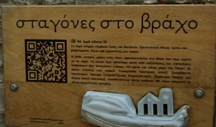 Στην Τήνο οι επισκέπτες έχουν την ευκαιρία να απολαύσουν μια ηχητική έκθεση, με τίτλο "Σταγόνες στο Βράχο" που φιλοξενεί ιστορίες κατοίκων του νησιού, με κοινό στοιχείο το νερό. Οι ακουστικές ιστορίες ψηφιοποιούνται και μέσω κώδικα QR γίνονται προσβάσιμες σε πέντε στάσεις σε ισάριθμα χωριά της Τήνου, όπως στον Ταραμπάδο (κεντρική πηγή), στον Σμαρδάκιτο (ποτίστρα), στα Λουτρά (στέρνα – κήπος πρώην Μονής & Σχολής Ουρσουλινών), στην Περάστρα (πηγή) και στην Κώμη (πηγή πλατείας).