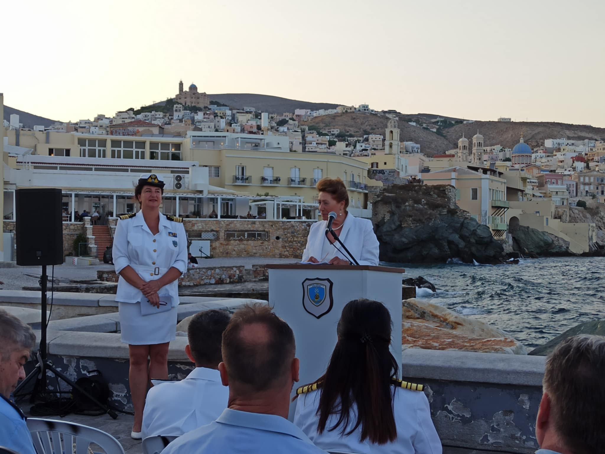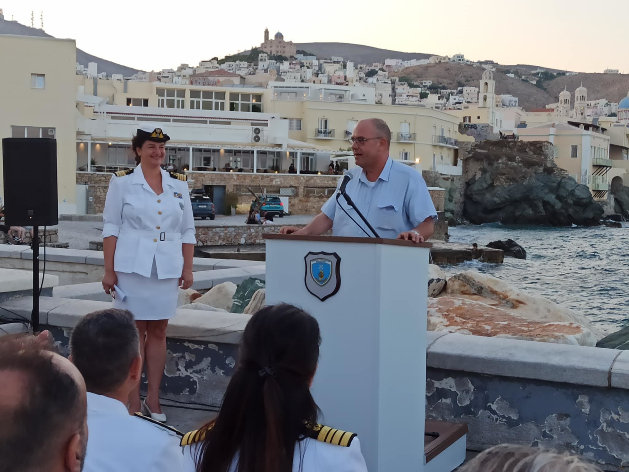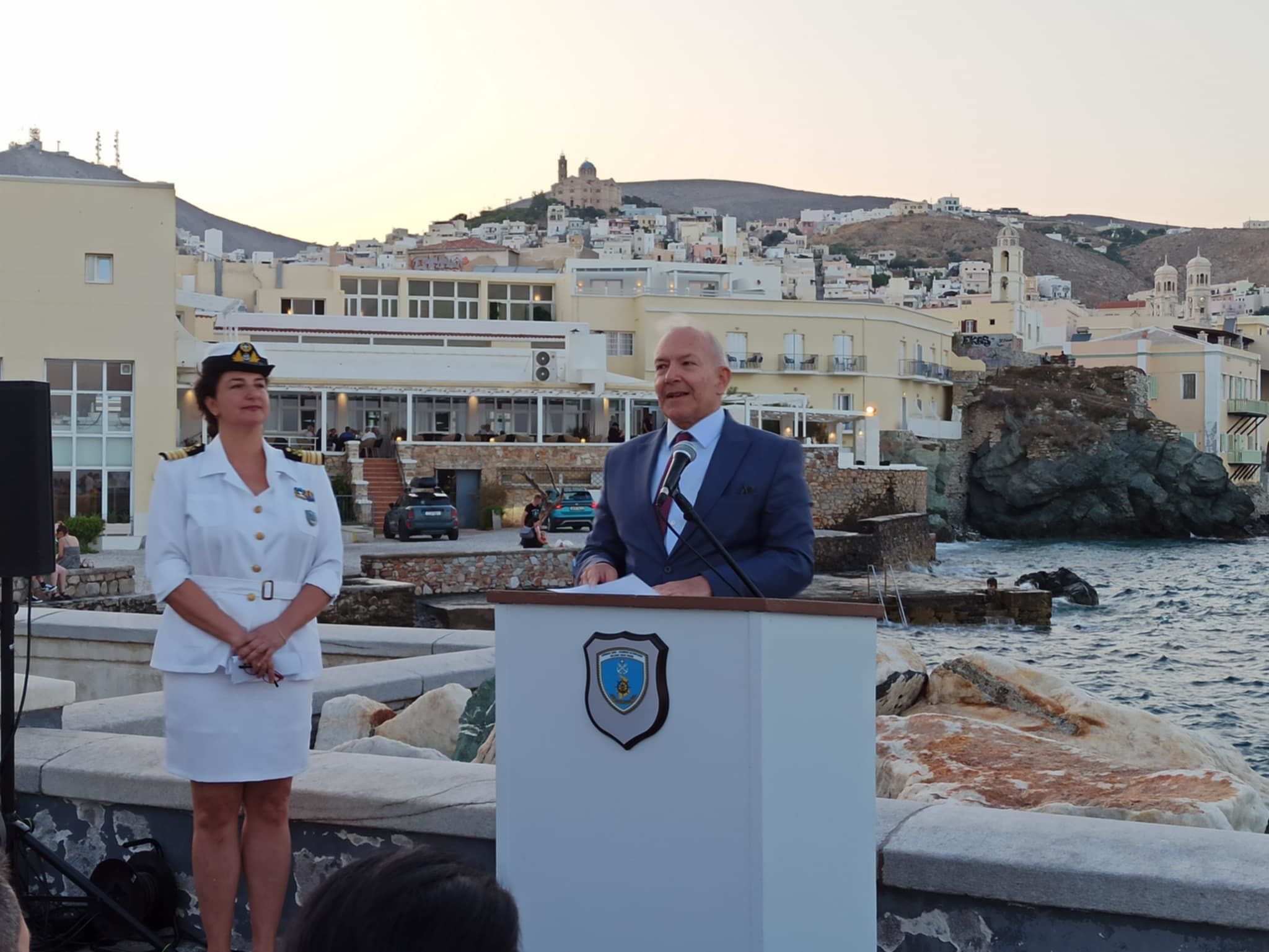 Στη σύντομη τοποθέτησή του ανέφερε, μεταξύ άλλων, ότι "η συγκεκριμένη έκθεση, η οποία αποτελεί κομμάτι από τις συλλογές του Ναυτικού Μουσείου της Ελλάδας, φιλοξενείται στους ιστορικούς χώρους της ΑΕΝ Σύρου και γι' αυτό είμαστε ιδιαίτερα χαρούμενοι", κάνοντας αναφορά στη συνέχεια για την ιστορική διαδρομή του Μουσείου το οποίο όπως είπε, από την ίδρυσή του το 1949, αποτελεί όχι μόνο έναν θεματοφύλακα της ναυτικής μας κληρονομιάς, αλλά και έναν χώρο έμπνευσης, μάθησης και σύνδεσης με το ένδοξο ναυτικό παρελθόν της χώρας.