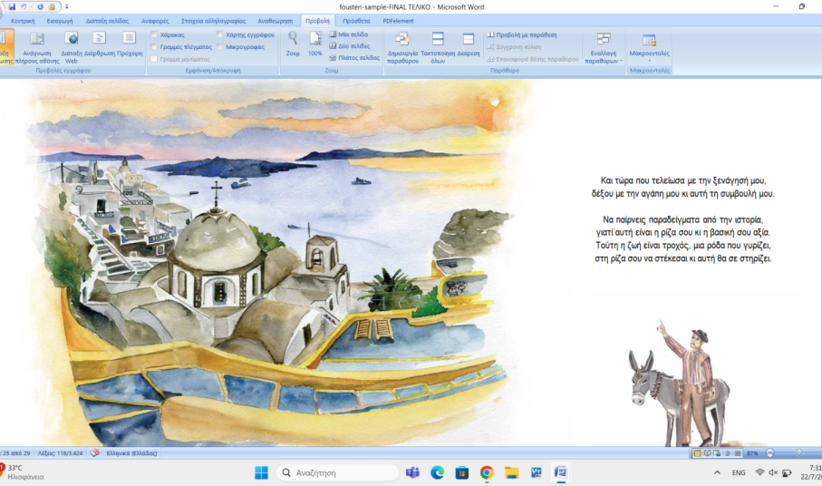 "Το συγκεκριμένο βιβλίο κυκλοφόρησε πριν από δύο χρόνια στην ελληνική γλώσσα και πριν ένα μήνα κυκλοφόρησε και στα αγγλικά. Σκοπός του είναι η προβολή του νησιού και το δημιούργησα καθαρά από την αγάπη μου στη Σαντορίνη", δήλωσε η κα. Φωστέρη.