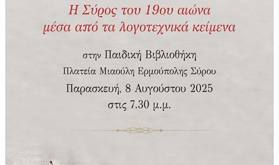 "Η Σύρος του 19ου αιώνα μέσα από λογοτεχνικά κείμενα", είναι το θέμα της ομιλίας που θα παρουσιάσει στο χώρο της Παιδικής Δημοτικής Βιβλιοθήκης, ο δ.φ. ιστορικός - αρχαιολόγος, Αντώνης Μαστραπάς.