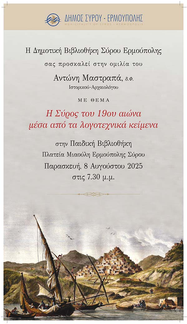 Η παρουσίαση του θέματος με τον τίτλο "Η Σύρος του 19ου αιώνα μέσα από λογοτεχνικά κείμενα", του δ.φ. ιστορικού – αρχαιολόγου, Αντώνη Μαστραπά, είναι μια προσπάθεια ανάπλασης, όσο αυτό είναι εφικτό, της εικόνας της Σύρου και της κοινωνίας της, από την οπτική που την προσέγγισαν οι λογοτέχνες του 19ου αιώνα. Δεν αποτελεί εμπεριστατωμένη ιστορική έρευνα, γιατί δεν έχει αξιοποιηθεί όλο το εύρος των πηγών και κυρίως γιατί αποφεύχθηκε εσκεμμένα η χρήση ιστοριογραφικών μαρτυριών. Η παρουσίαση του θέματος βασίζεται στον αυθορμητισμό και την αμεσότητα των λογοτεχνών που έζησαν και έγραψαν για τη Σύρο τον 19ο αιώνα.