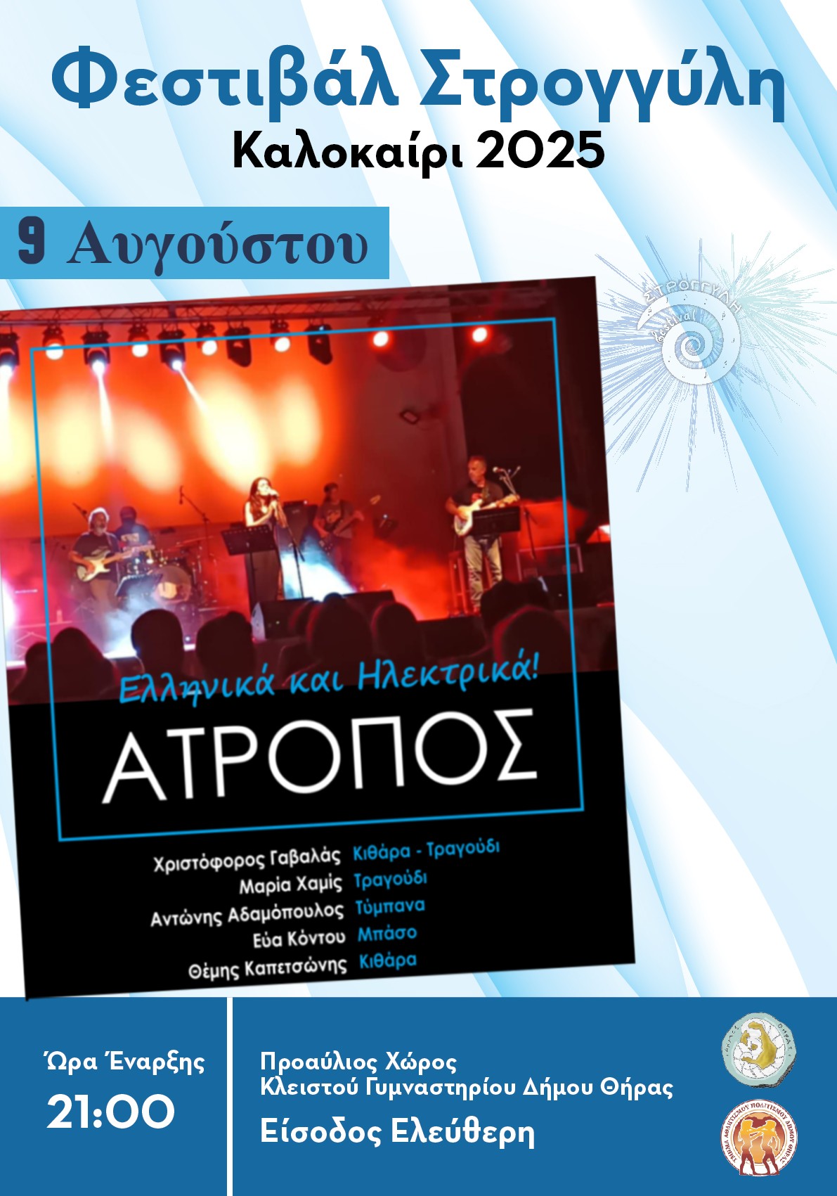 Το τοπικό συγκρότημα «Άτροπος» θα ανέβει στη σκηνή του «8ου Φεστιβάλ Στρογγύλη» το Σάββατο 9 Αυγούστου 2025 στις 21:00 στον Προαύλιο Χώρο του Κλειστού Γυμναστηρίου Δήμου Θήρας.
