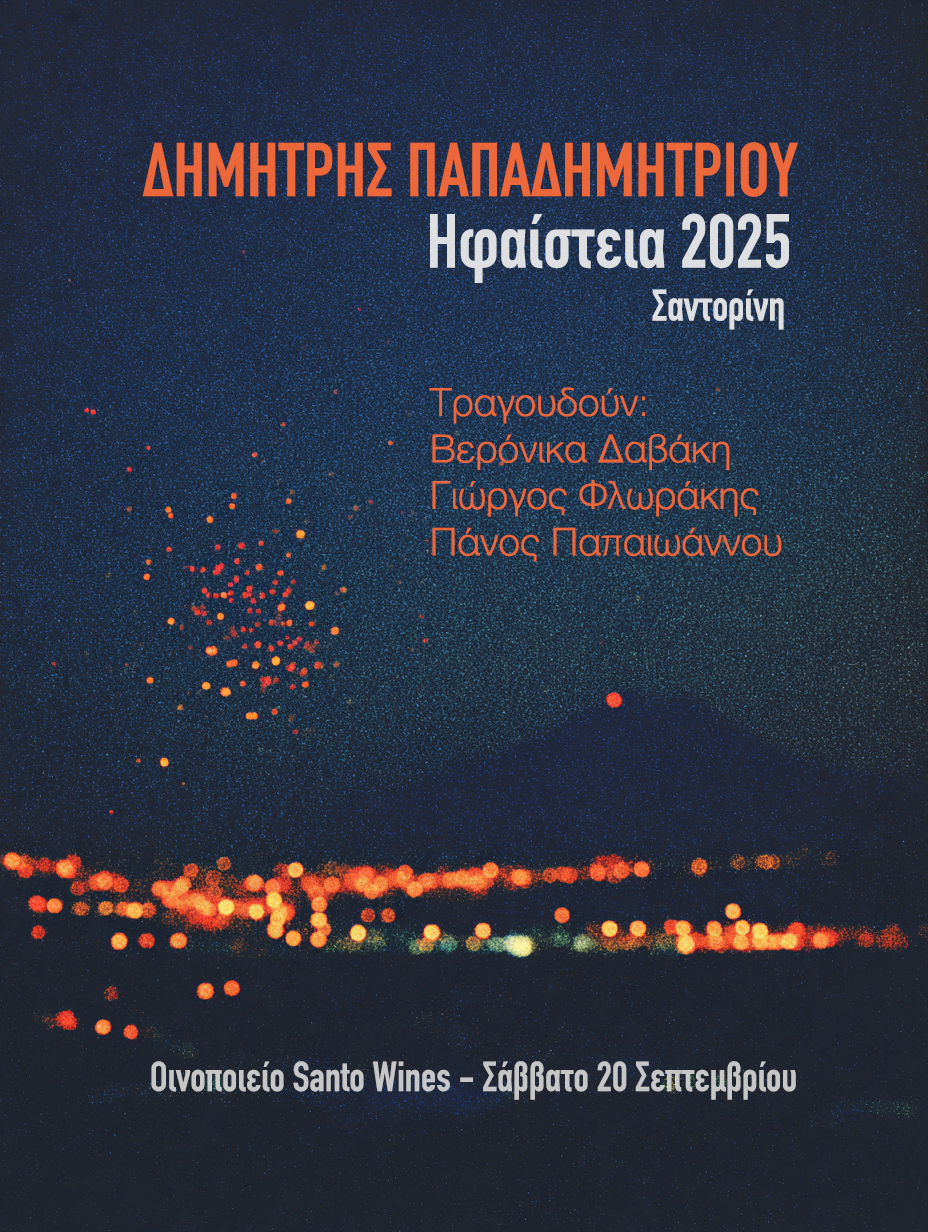 Η Θήρα, το νησί που γεννήθηκε από τη φωτιά και την έκρηξη της γης, τόπος που συμβολίζει τη δύναμη της καταστροφής αλλά και της δημιουργίας, υποδέχεται για πρώτη φορά τον σπουδαίο Έλληνα συνθέτη Δημήτρη Παπαδημητρίου στο πλαίσιο των εκδηλώσεων Ηφαίστεια 2025.