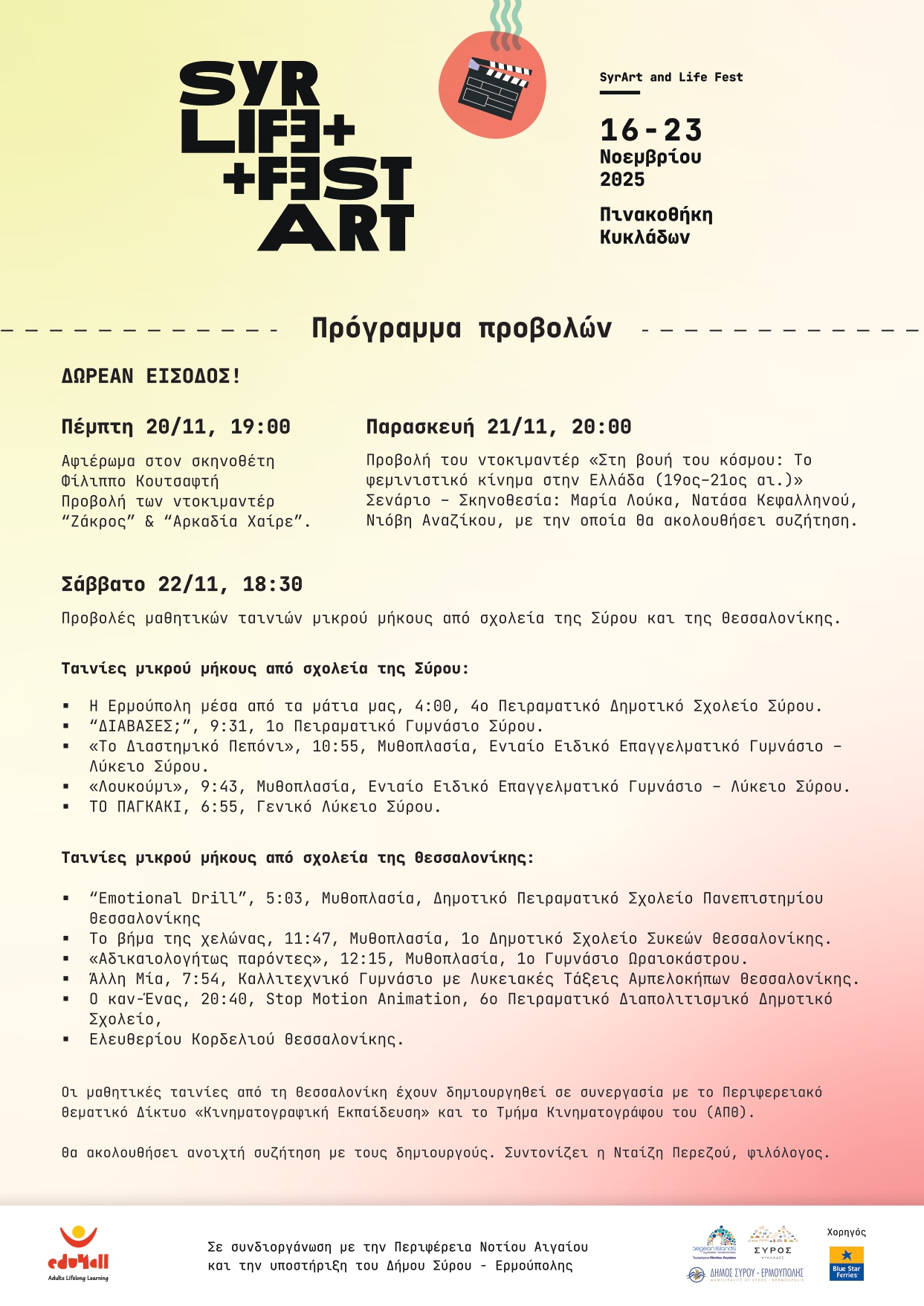 Η Σύρος υποδέχεται το SyrArt and Life Fest, ένα πολυθεματικό φεστιβάλ για την Τέχνη και τη Ζωή, που φέρνει κοντά ζωγραφική, φωτογραφία, μουσική και κινηματογράφο, με κοινό άξονα την αλληλεπίδραση και τη δύναμη της τέχνης να εμπνέει και να ενώνει. Για 8 ημέρες, καλλιτέχνες και κοινό θα συνδημιουργήσουν μέσα από εκθέσεις, προβολές, συζητήσεις και εργαστήρια, αναδεικνύοντας τη βαθιά σχέση ανάμεσα στην τέχνη και την ανθρώπινη εμπειρία. Περιλαμβάνει: · Εικαστική Έκθεση και Ψηφιακή Έκθεση Φωτογραφίας · Διήμερο Εργαστήριο Δημιουργίας Ντοκιμαντέρ · Μουσική εκδήλωση · Ανοιχτές Συζητήσεις και Προβολές Ντοκιμαντέρ και Μαθητικών Ταινιών Μικρού Μήκους Πρόγραμμα Προβολών Πέμπτη 20/11, 19:00: Αφιέρωμα στον σκηνοθέτη Φίλιππο Κουτσαφτή : Προβολή των ντοκιμαντέρ "Ζάκρος" & "Αρκαδία Χαίρε" Παρασκευή 21/11, 20:00: Προβολή του ντοκιμαντέρ «Στη βουή του κόσμου: Το φεμινιστικό κίνημα στην Ελλάδα (19ος–21ος αι.)» Σενάριο – Σκηνοθεσία: Μαρία Λούκα, Νατάσα Κεφαλληνού, Νιόβη Αναζίκου. Θα ακολουθήσει συζήτηση με τη Νιόβη Αναζίκου. Σάββατο 22/11, 18:30: Προβολές μαθητικών ταινιών μικρού μήκους από σχολεία της Σύρου και της Θεσσαλονίκης. Ταινίες μικρού μήκους από σχολεία της Σύρου: · Η Ερμούπολη μέσα από τα μάτια μας, 4:00, 4ο Πειραματικό Δημοτικό Σχολείο Σύρου. -"ΔΙάΒΑΣΕΣ;", 9:31, 1o Πειραματικό Γυμνάσιο Σύρου · «Το Διαστημικό Πεπόνι», 10:55, Μυθοπλασία, Ενιαίο Ειδικό Επαγγελματικό Γυμνάσιο – Λύκειο Σύρου · «Λουκούμι», 9:43, Μυθοπλασία, Ενιαίο Ειδικό Επαγγελματικό Γυμνάσιο – Λύκειο Σύρου · ΤΟ ΠΑΓΚΑΚΙ, 6:55, Γενικό Λύκειο Σύρου. Ταινίες μικρού μήκους από σχολεία της Θεσσαλονίκης: · "Emotional Drill", 5:03, Μυθοπλασία, Δημοτικό Πειραματικό Σχολείο Πανεπιστημίου Θεσσαλονίκης · Το βήμα της χελώνας, 11:47, Μυθοπλασία, 1o Δημοτικό Σχολείο Συκεών Θεσσαλονίκης · «Αδικαιολογήτως παρόντες», 12:15, Μυθοπλασία, 1o Γυμνάσιο Ωραιοκάστρου · Άλλη Μία, 7:54, Καλλιτεχνικό Γυμνάσιο με Λυκειακές Τάξεις Αμπελοκήπων Θεσσαλονίκης · O καν-Ένας, 20:40, Stop Motion Animation, 6ο Πειραματικό Διαπολιτισμικό Δημοτικό Σχολείο, Ελευθερίου Κορδελιού Θεσσαλονίκης. Οι μαθητικές ταινίες από τη Θεσσαλονίκη έχουν δημιουργηθεί σε συνεργασία με το Περιφερειακό Θεματικό Δίκτυο «Κινηματογραφική Εκπαίδευση» και το Τμήμα Κινηματογράφου του Αριστοτελείου Πανεπιστημίου Θεσσαλονίκης (ΑΠΘ). Θα ακολουθήσει ανοιχτή συζήτηση με τους δημιουργούς. Συντονίζει η Νταίζη Περεζού, φιλόλογος. Δείτε εδώ το Αναλυτικό πρόγραμμα του Φεστιβάλ Σύρου για την Τέχνη και τη Ζωή. Email επικοινωνίας edu4allaegean@gmail.com Όλες οι δράσεις είναι με δωρεάν είσοδο. Σε συνδιοργάνωση με την Περιφέρεια Νοτίου Αιγαίου και την υποστήριξη του Δήμου Σύρου- Ερμούπολης.