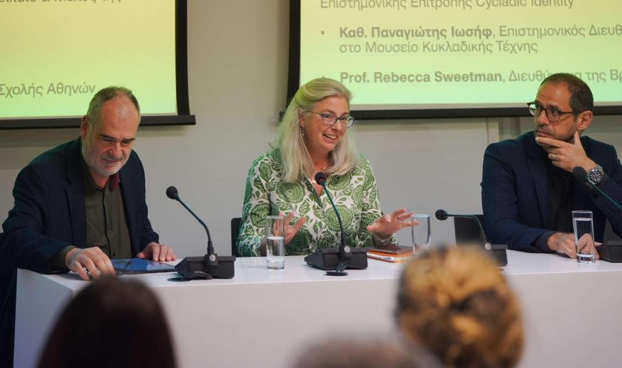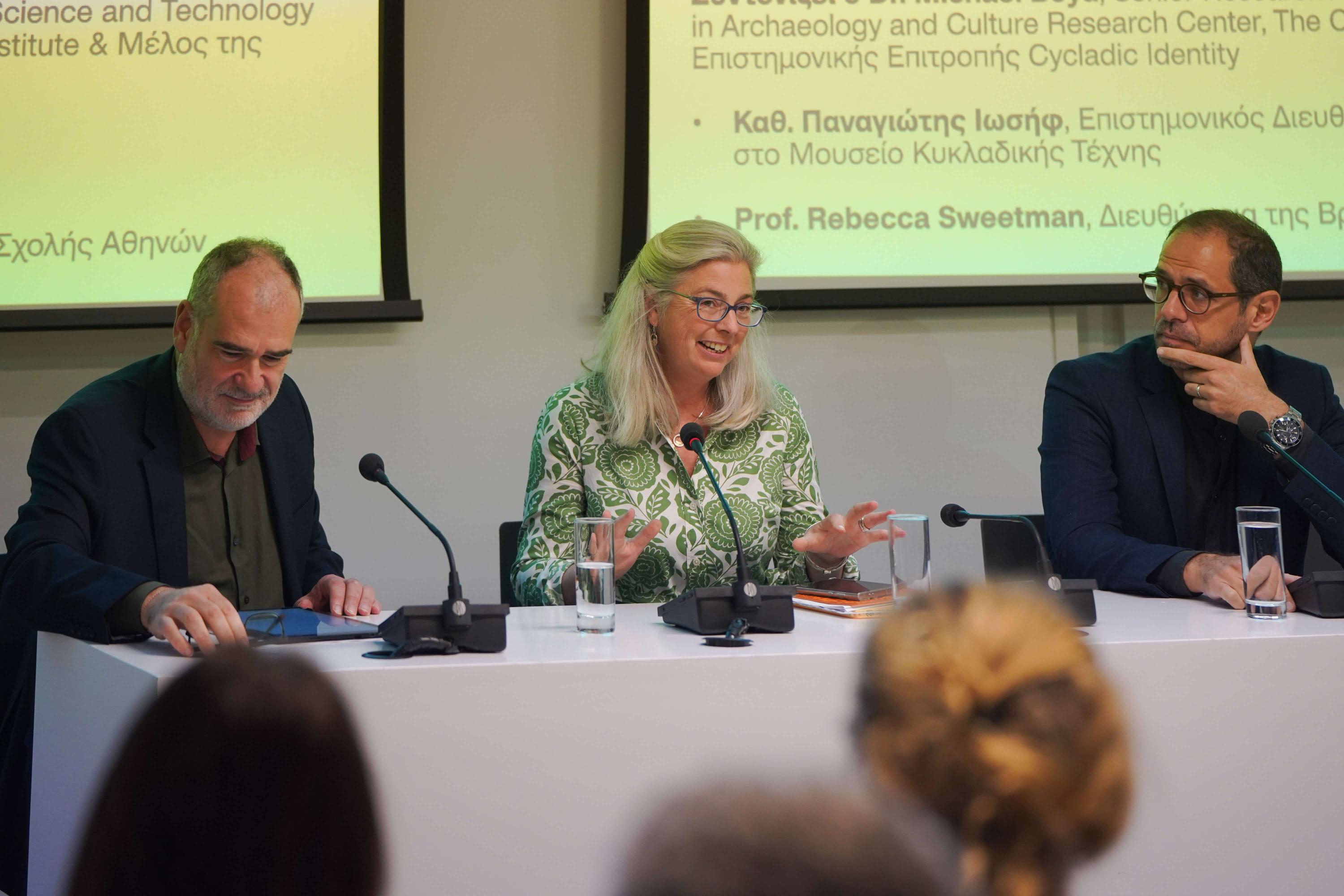 Η Καθηγήτρια Rebeca Sweetman, Διευθύντρια της Βρετανικής Σχολής Αθηνών, ανέδειξε τη μοναδική ιστορική συνέχεια των Κυκλάδων που παραμένουν κατοικημένες από τα προϊστορικά χρόνια μέχρι σήμερα. Τόνισε τη διαχρονική ανθεκτικότητα των νησιών απέναντι σε κατακτήσεις και εξωτερικές πιέσεις — από τους Πέρσες και τους Αθηναίους έως τους Οθωμανούς — και τη διατήρηση των τοπικών παραδόσεων μέσα στους αιώνες. Επιπλέον, επισήμανε τη σημασία της διασύνδεσης μεταξύ των νησιών που συνέβαλε στην επιβίωσή τους, τον ρόλο των γυναικών ήδη από τη ρωμαϊκή περίοδο και την περιβαλλοντική προσαρμοστικότητα των Κυκλάδων στις δύσκολες συνθήκες τους.