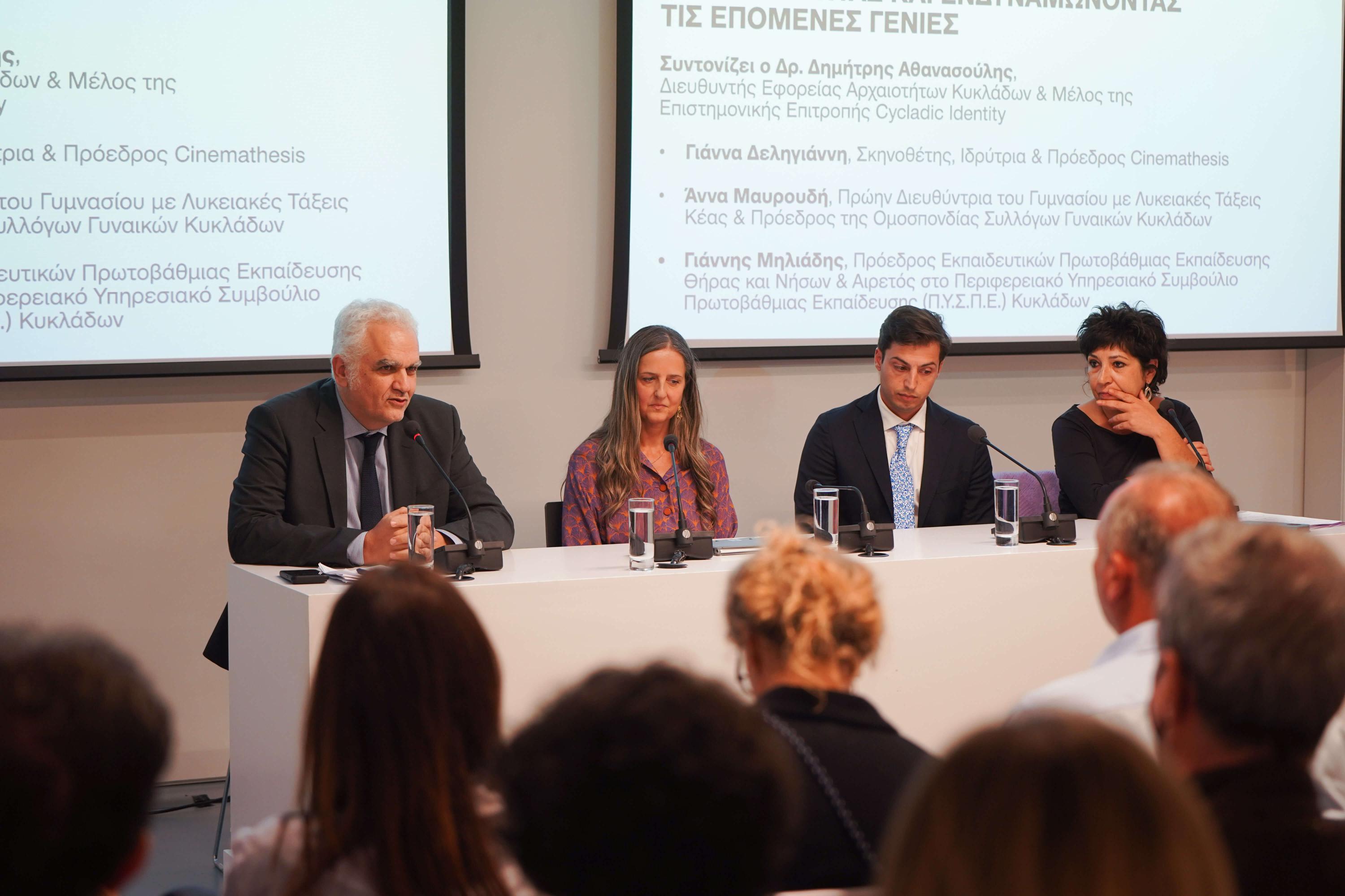Ο Δημήτρης Αθανασούλης, Διευθυντής της Εφορείας Αρχαιοτήτων Κυκλάδων και Μέλος της Επιστημονικής Επιτροπής Cycladic Identity, άνοιξε τη θεματική «Ενεργοποιώντας και Εκπαιδεύοντας τις Επόμενες Γενιές», επισημαίνοντας την ανάγκη σύνδεσης παιδείας και πολιτισμού. Αν η σχολική εκπαίδευση δεν προσφέρει ουσιαστική επαφή με τον πολιτισμό, τότε εμποδίζει τα παιδιά να τον αγαπήσουν και να τον προστατεύσουν — ακόμη και σε μικρές κοινωνίες, όπως οι Κυκλάδες. Όπως ανέφερε: «Όταν η παιδεία και ο πολιτισμός είναι δύο ασύμβατοι και ασύμπτωτοι κόσμοι, αυτό έχει τεράστιες επιπτώσεις: όχι μόνο γιατί βγαίνουν με λειψή παιδεία τα παιδιά μας, αλλά γιατί αυτή η παιδεία τελικά, τα εμποδίζει να σώσουν τα ίδια τα μνημεία, να τα αγαπήσουν και να γίνουν κτήμα δικό τους.»