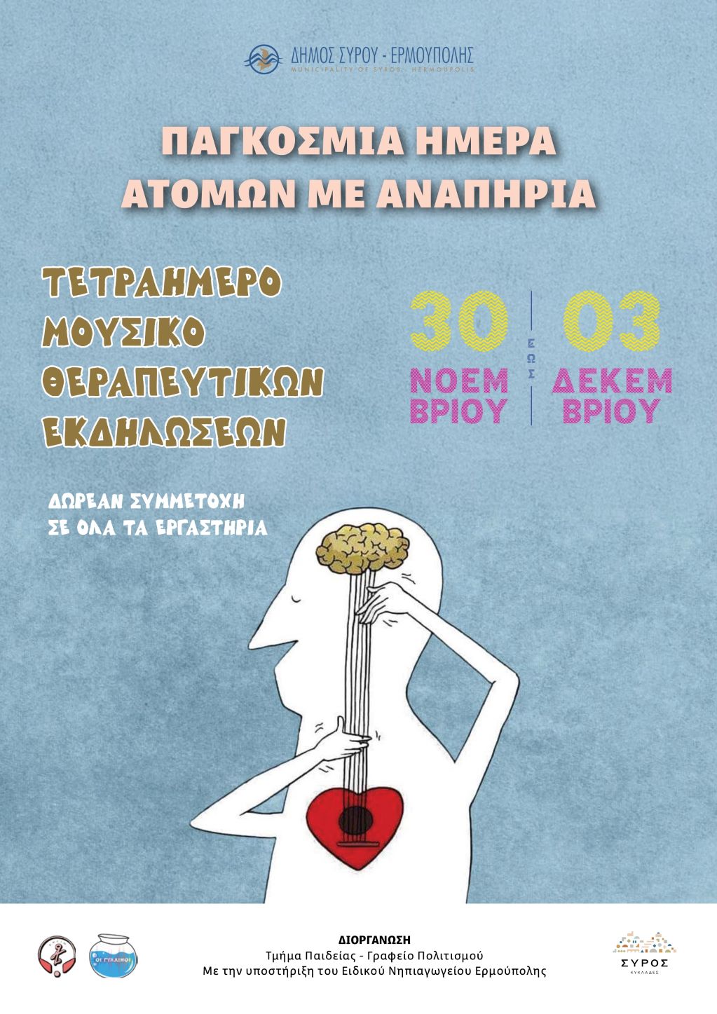 Ο Δήμος Σύρου - Ερμούπολης τιμάει την Παγκόσμια Ημέρα Ατόμων με Αναπηρία με ένα ξεχωριστό τετραήμερο μουσικοθεραπευτικών εκδηλώσεων για παιδιά με ειδικές εκπαιδευτικές ανάγκες και ενήλικες, από την Κυριακή 30 Νοεμβρίου έως Τετάρτη 3 Δεκεμβρίου.