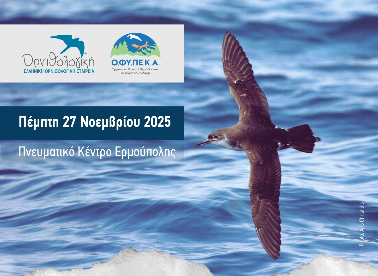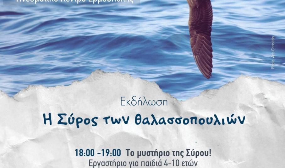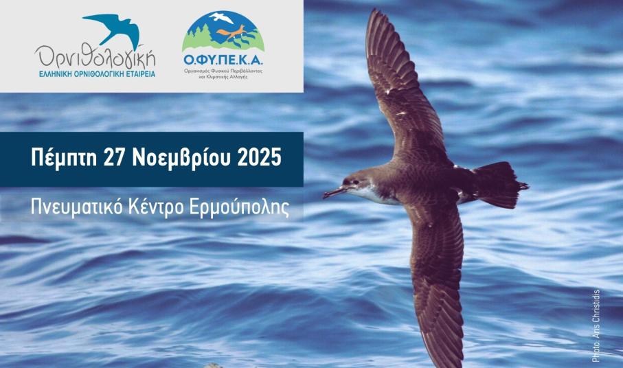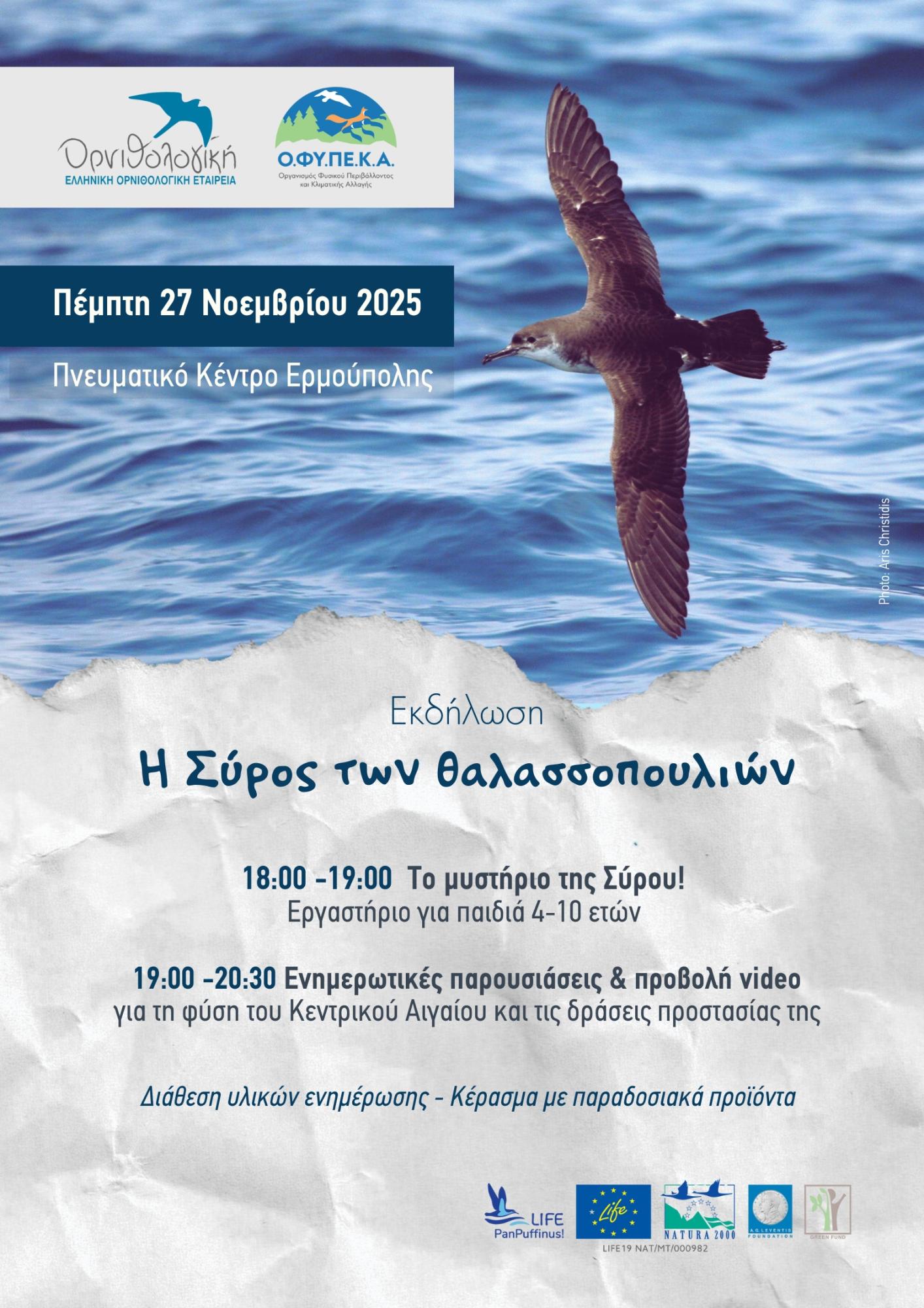 Η Ελληνική ΟΡΝΙΘΟΛΟΓΙΚΗ Εταιρεία και η Μονάδα Διαχείρισης Προστατευόμενων Περιοχών Κεντρικού Αιγαίου του Ο.ΦΥ.ΠΕ.Κ.Α. προσκαλούν το κοινό της Σύρου και κάθε ενδιαφερόμενο/η σε μια ανοιχτή εκδήλωση, για κάθε ηλικία, αφιερωμένη στα θαλασσοπούλια και τη μοναδική φύση του Αιγαίου, το απόγευμα της Πέμπτης 27 Νοεμβρίου 2025, στο Πνευματικό Κέντρο Ερμούπολης (αίθουσα Γ. Ρίτσου).