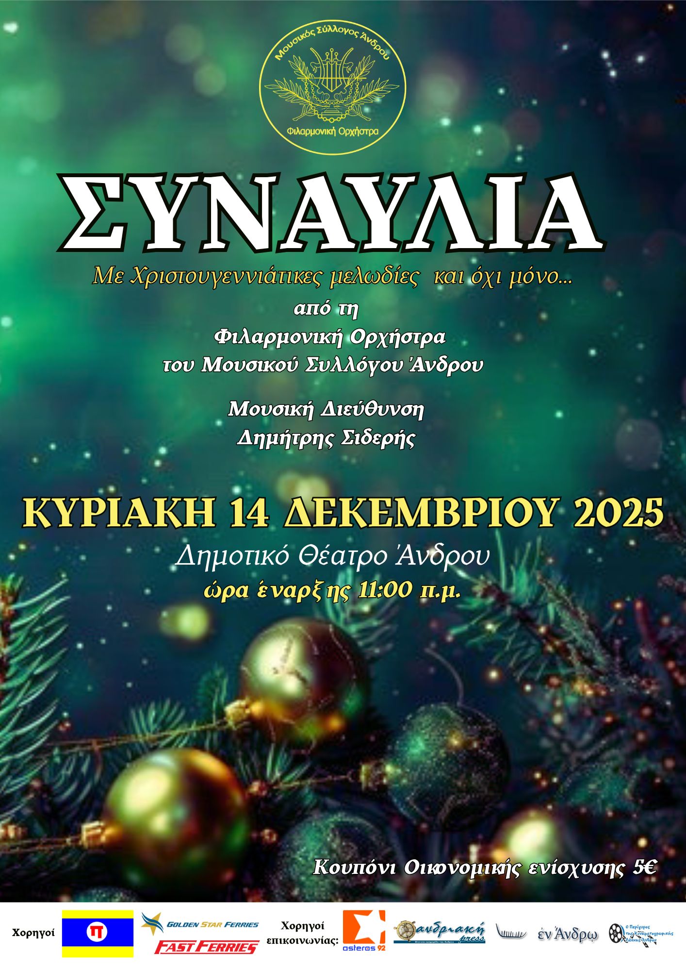 Ο Μουσικός Σύλλογος Άνδρου έχει τη χαρά να προσκαλέσει το κοινό στη χειμερινή-εορταστική συναυλία