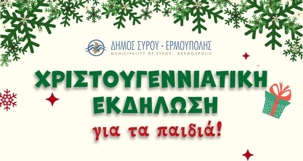 Με ανακοίνωσή του, το Τμήμα Πολιτισμού του Δήμου Σύρου - Ερμούπολης, προσκαλεί μικρούς και μεγάλους σε μια χαρούμενη παιδική χριστουγεννιάτικη εκδήλωση, που θα πραγματοποιηθεί το Σάββατο 20 Δεκεμβρίου, στις 17.00 στο Κίνι.