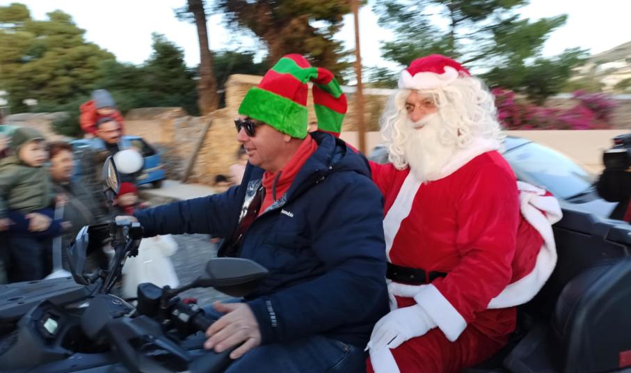 Συγκεκριμένα, λίγο μετά τις 4 το απόγευμα, ο Άι Βασίλης, καβάλα σε ένα τετράτροχο όχημα ή διαφορετικά “γουρούνα” και συνοδευόμενος από τα αγαπημένα του ξωτικά, εισήλθε στο χώρο του πάρκου, μοιράζοντας χαμόγελα στους δεκάδες μικρούς του φίλους που τον περίμεναν με ανυπομονησία.