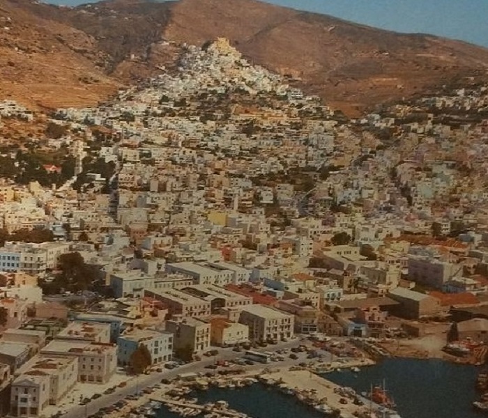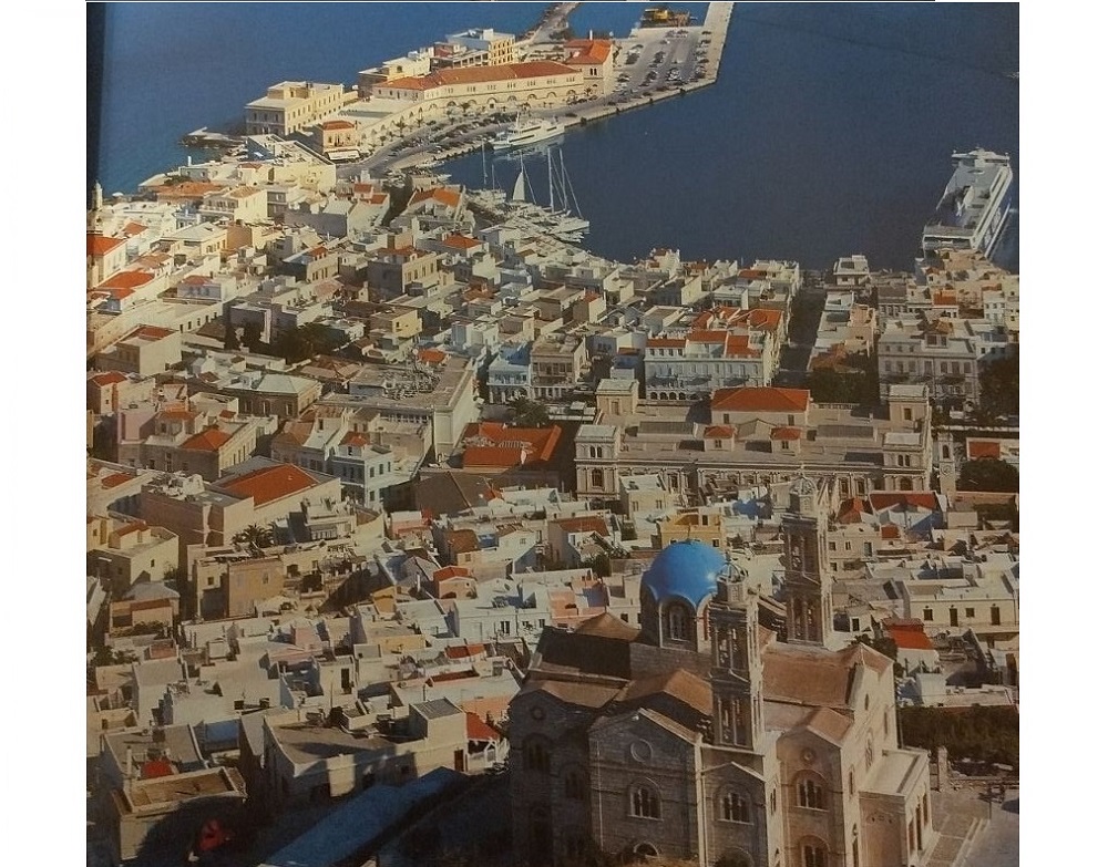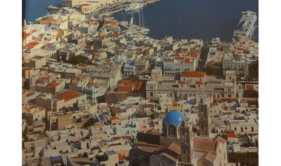 Όταν το πλοίο πλησιάζει στο λιμάνι της Σύρου, η εικόνα των δύο λόφων που φιλοξενούν τις δύο πόλεις, εντυπωσιάζει και συναρπάζει τους επισκέπτες. Δύο πόλεις, δύο κοινωνίες που… “έκτισαν σε μια κλίμακα με την πιο δυνατή αμφιθεατρικότητα”. Δύο λόφοι και δύο κόσμοι - καθολικοί και Ορθόδοξοι - δίνουν τα χέρια. Ο Θεός είναι ένας. Η Σύρος, όπως και τα υπόλοιπα Κυκλαδονήσια αναδύεται από τη θάλασσα υπό μορφή γυμνών απότομων βράχων. Και το πρώτο της όνομα Σουρ, ή Οσούρα ή Συρίη, όπως θέλει ο Όμηρος. “Νήσος τις Συρίη κικλήσεται εί που ακούης, Ορτυγίας καθυπερθεν οθ, τροπαι ηελίαιο…” (Οδύσεια, ραψωδία στίχος 403-435). Με αυτούς τους στίχους ο Εύμαιος, το βασιλόπουλο της Σύρου, περιγράφει στον Οδυσσέα τον τόπο καταγωγής του, (Ορτυγία είναι η Δήλος και δυτικά της είναι η Σύρος).