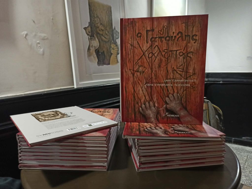 “Ο κεντρικός μου ήρωας είναι εμπνευσμένος από τον Γιαννούλη Χαλεπά, τον Τηνιακό καλλιτέχνη, τον οποίο συνδύαζα με τις γάτες που συναντούσα στους δρόμους της Τήνου, καθώς έχω αφιερώσει άπειρες ώρες, κυρίως με τις αδέσποτες γάτες. Έτσι και βγήκε αυτή η έκδοση. Πως δηλαδή ένας γάτος μπορεί να γίνει καλλιτέχνης. Η ιδέα προέκυψε από ένα φρέσκο τσιμέντο το οποίο είχε πατήσει μία γάτα, αφήνοντας σε αυτό τα ίχνη της, τα πατουσάκια της. Αυτή λοιπόν η εικόνα, δημιούργησε στο μυαλό μου μία ιστορία, όπως ότι την επόμενη ημέρα κάποιος που θα εκνευριζόταν που μία γάτα προκάλεσε αυτή τη ζημιά, ενώ για την ίδια την γάτα, αυτό μεταφράζεται ως τέχνη. Κάπως έτσι λοιπόν προέκυψε ο χαρακτήρας του βιβλίου. Ακολούθησε μία μικρή ιστορία, την οποία και μοιράστηκα με τη συγγραφέα, Χαρά Γιαννακοπούλου, όπου εκείνη με τη σειρά της την εμπλούτισε και την απόδωσε. Ακολούθησε η εικονογράφηση από τον Πάρι Ξυνταριανό Τσιροπινά, με τον οποίο είχαμε μία παλιά συνεργασία με τους “Πειρατές του Αιγαίου” το 2019 στο θέατρο Απόλλων, είπε χαρακτηριστικά.