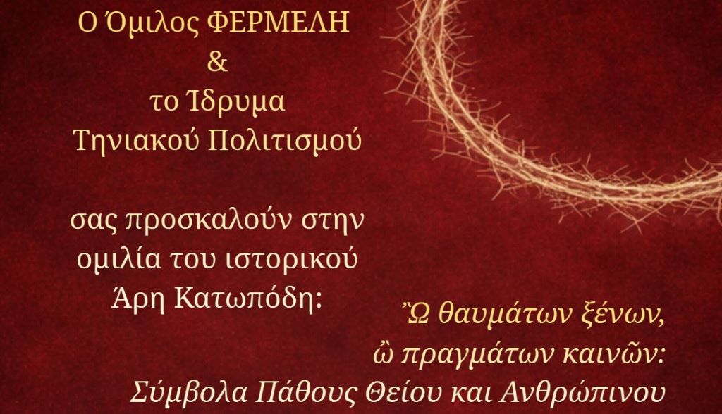 Τη διάλεξη του ιστορικού Άρη Κατωπόδη με τίτλο: “Ω θαυμάτων ξένων, ω πραγμάτων καινών: Σύμβολα Πάθους Θείου και Ανθρώπινου”, παρουσιάζει το Σάββατο 4 Απριλίου και ώρα 19:00, το Ίδρυμα Τηνιακού Πολιτισμού.